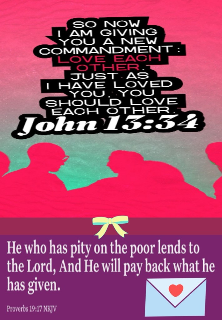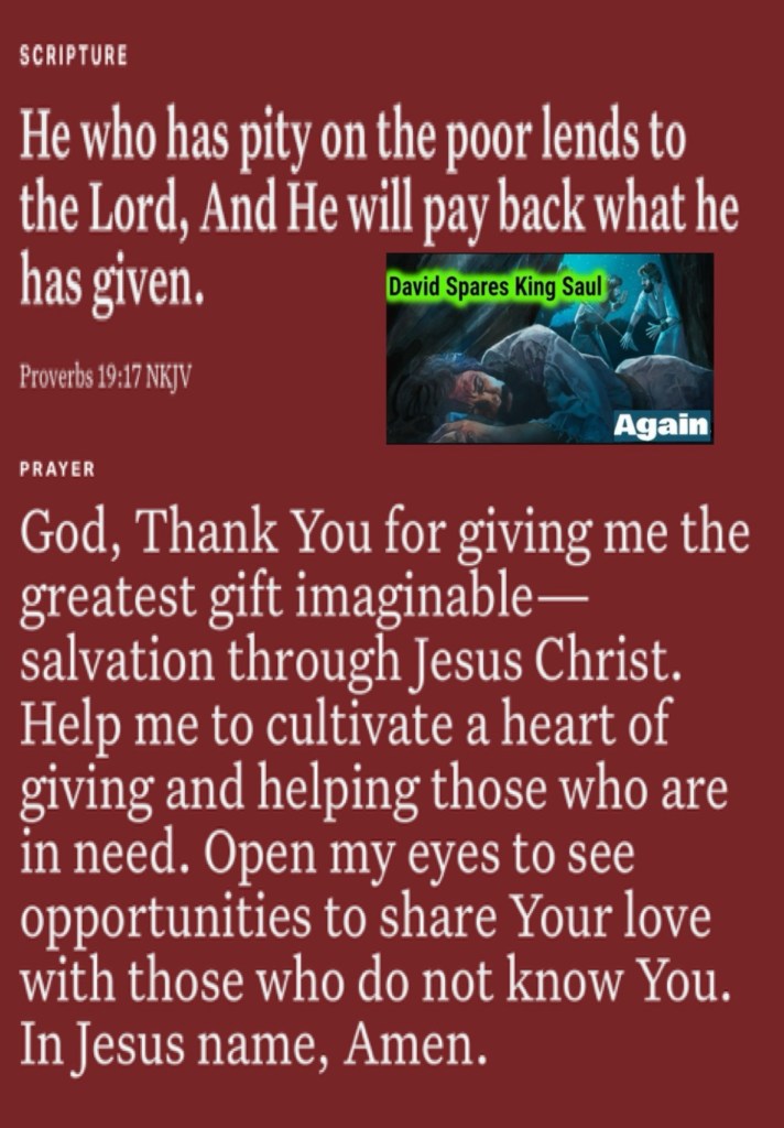 Today’s lesson 1 Samuel 26/31, today’s verses: “A new commandment I give to you, that you love one another; as I have loved you, that you also love one another.” John 13:34 “He who has pity on the poor lends to the Lord, And He will pay back what he has given.” Proverbs 19:17