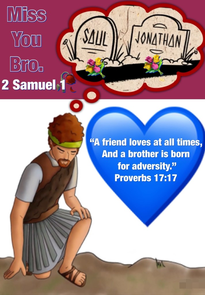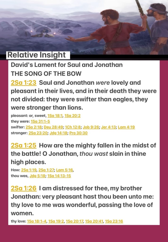 ““Saul and Jonathan were beloved and pleasant in their lives, And in their death they were not divided; They were swifter than eagles, They were stronger than lions. “How the mighty have fallen in the midst of the battle! Jonathan was slain in your high places. I am distressed for you, my brother Jonathan; You have been very pleasant to me; Your love to me was wonderful, Surpassing the love of women.” II Samuel 1:23, 25-26