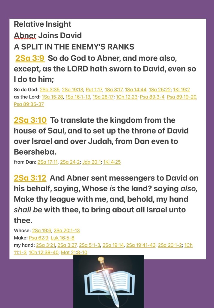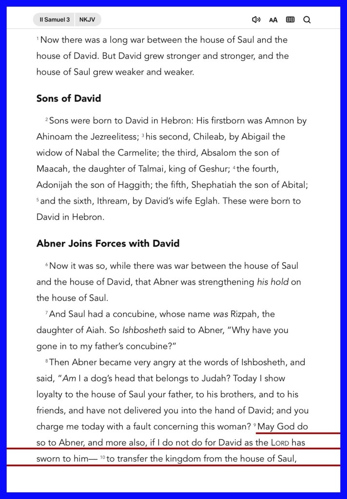 “May God do so to Abner, and more also, if I do not do for David as the Lord has sworn to him— to transfer the kingdom from the house of Saul, and set up the throne of David over Israel and over Judah, from Dan to Beersheba.” Then Abner sent messengers on his behalf to David, saying, “Whose is the land?” saying also, “Make your covenant with me, and indeed my hand shall be with you to bring all Israel to you.”” II Samuel 3:9-10, 12