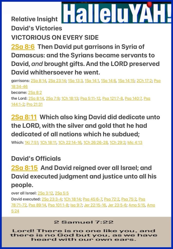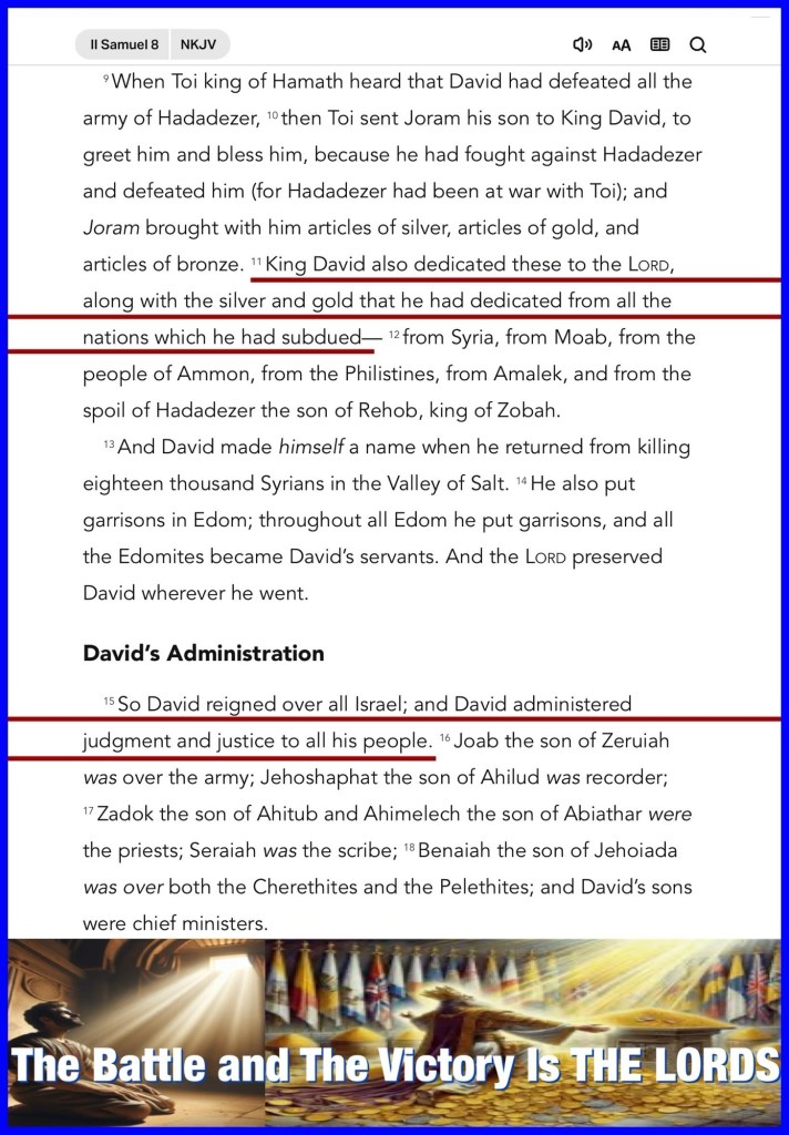 “Then David put garrisons in Syria of Damascus; and the Syrians became David’s servants, and brought tribute. So the Lord preserved David wherever he went. King David also dedicated these to the Lord, along with the silver and gold that he had dedicated from all the nations which he had subdued— So David reigned over all Israel; and David administered judgment and justice to all his people.” II Samuel 8:6, 11, 15
