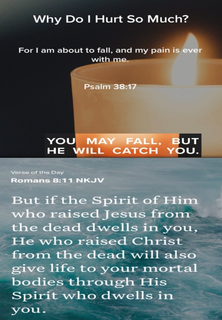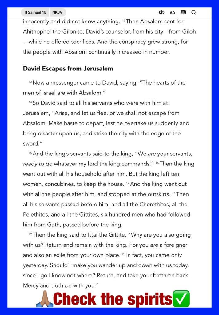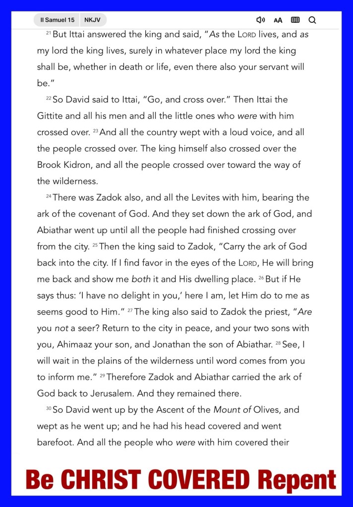 Today’s lesson 2 Samuel 15/24, today’s verses: “For I am ready to fall, And my sorrow is continually before me.” Psalms 38:17 “But if the Spirit of Him who raised Jesus from the dead dwells in you, He who raised Christ from the dead will also give life to your mortal bodies through His Spirit who dwells in you.” Romans 8:11