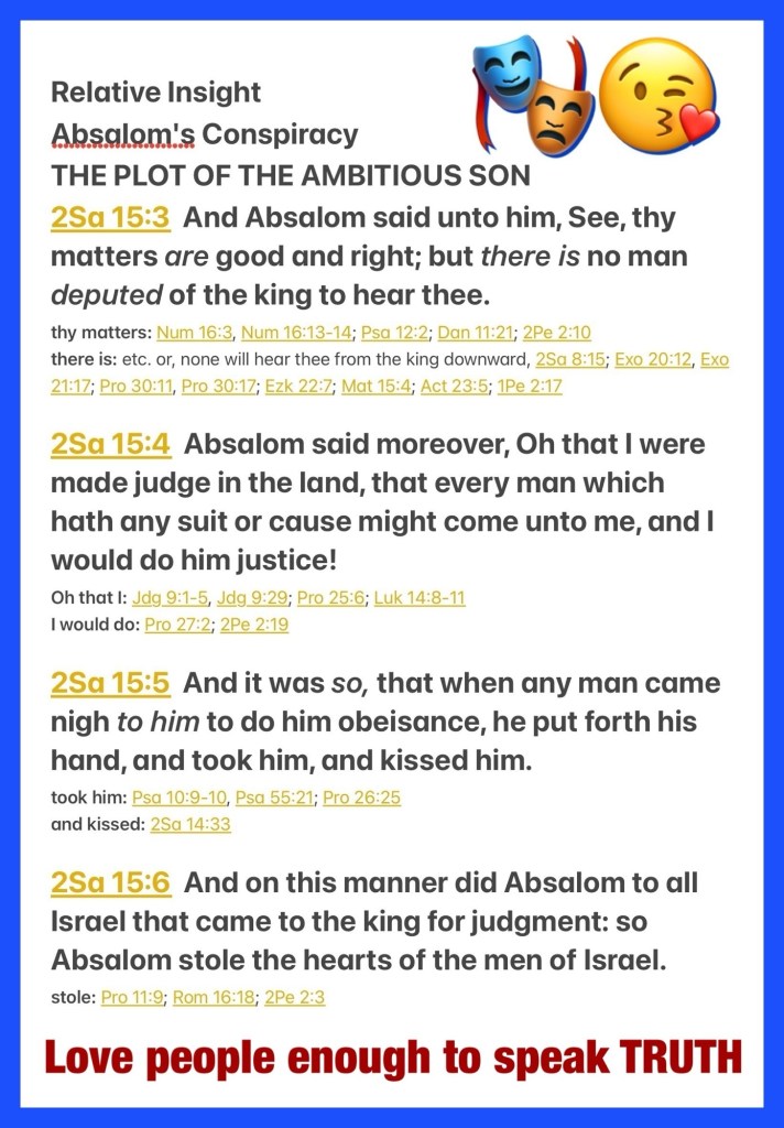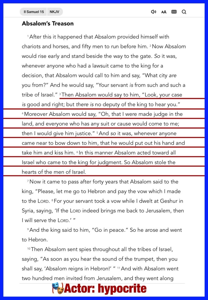 “Then Absalom would say to him, “Look, your case is good and right; but there is no deputy of the king to hear you.” Moreover Absalom would say, “Oh, that I were made judge in the land, and everyone who has any suit or cause would come to me; then I would give him justice.” And so it was, whenever anyone came near to bow down to him, that he would put out his hand and take him and kiss him. In this manner Absalom acted toward all Israel who came to the king for judgment. So Absalom stole the hearts of the men of Israel.” II Samuel 15:3-6