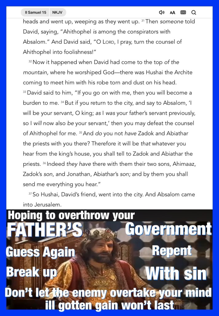 Greetings BeLoved child Of THE MOST HIGH GOD JESUS CHRIST: YAHUSHA HA’MASSIACH: THE KING Of Kings And LORD Of Lords Recognize your pedigree it’s because of who you are in CHRIST that this fierce battle against your soul even exists but I want to remind you incase the world is telling you something else for so long that you believe it; the enemy is Stealing the hearts, souls and destinies of THE Children Of GOD that said I present today’s lesson let’s explore and examine the spirit of Absalom whose Intents became Disappointed Disillusioned Deadly Spiritual Warfare: Wrongful Ambition: Stealing The Hearts Of Men. FATHER YAH Deliver us, Fill us with Your HOLY SPIRIT Wisdom Discernment that we may Live In Your LOVE in a restless and reckless world in JESUS CHRIST Name I pray Amen. Thank you for stopping by to share in THE WORD: THE BREAD OF LIFE Be Filled.