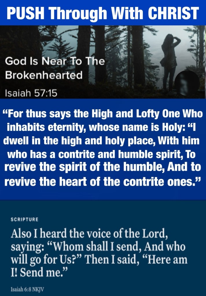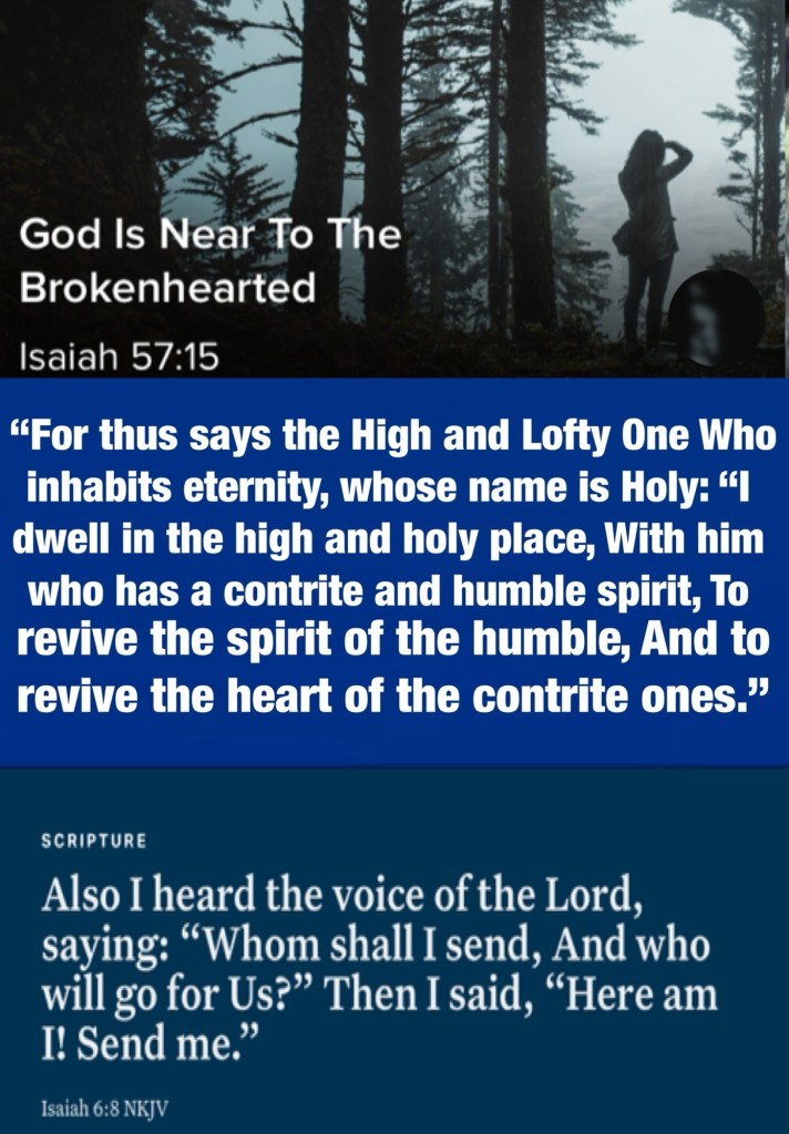 Today’s lesson 2 Samuel 17/24, today’s verses: “For thus says the High and Lofty One Who inhabits eternity, whose name is Holy: “I dwell in the high and holy place, With him who has a contrite and humble spirit, To revive the spirit of the humble, And to revive the heart of the contrite ones.” Isaiah 57:15 “Also I heard the voice of the Lord, saying: “Whom shall I send, And who will go for Us?” Then I said, “Here am I! Send me.” Isaiah 6:8