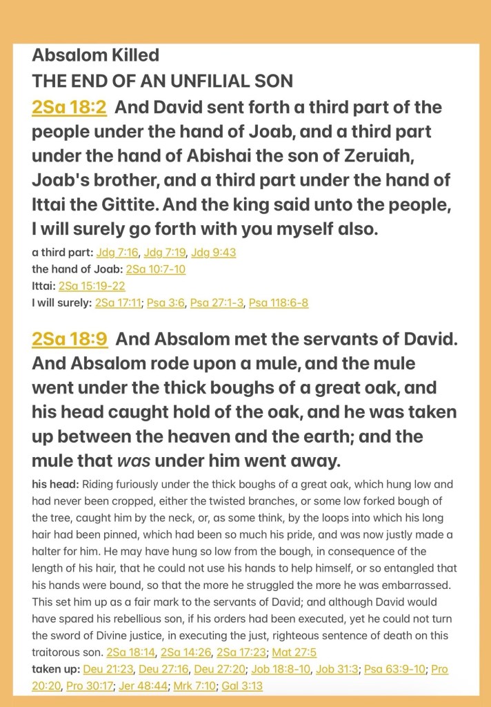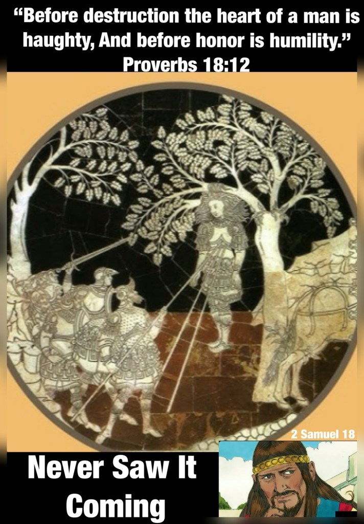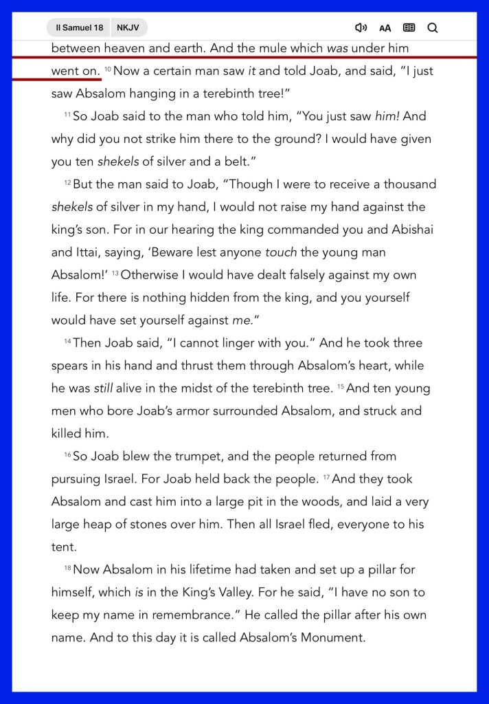 “Then David sent out one third of the people under the hand of Joab, one third under the hand of Abishai the son of Zeruiah, Joab’s brother, and one third under the hand of Ittai the Gittite. And the king said to the people, “I also will surely go out with you myself.” … Then Absalom met the servants of David. Absalom rode on a mule. The mule went under the thick boughs of a great terebinth tree, and his head caught in the terebinth; so he was left hanging between heaven and earth. And the mule which was under him went on.” II Samuel 18:2, 9