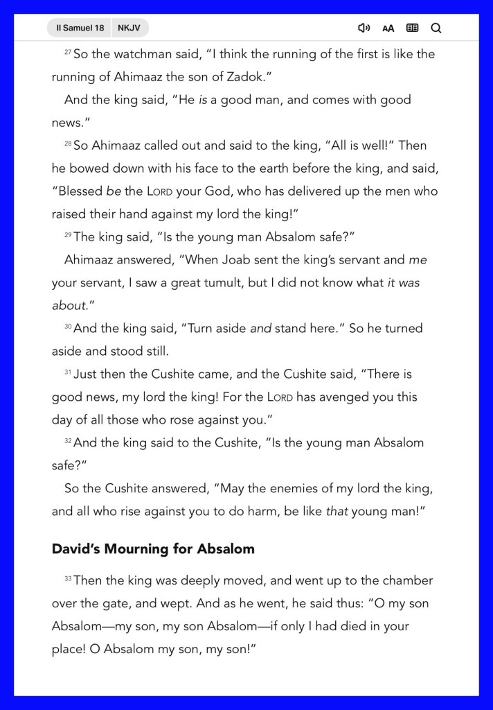 Happy Sabbath Greetings BeLoved child Of THE KING Of Kings THE MOST HIGH GOD JESUS (YAH) CHRIST SAVIOR DELIVERER our Only Hope to make it through the spiritual warfare of life. In today’s lesson we examine the physical, literal and spiritual outcomes and aspects of a life lived unrepentant and Tangled in sin: the end of Absalom’s rebellion against his father and ultimately our Heavenly FATHER; Take Heed. Thank you for stopping here I pray you are Blessed and if you should be entangled by sin that today you Repent and experience Freedom in CHRIST and stay Tangled In His LOVE Walk Good Be Loved.