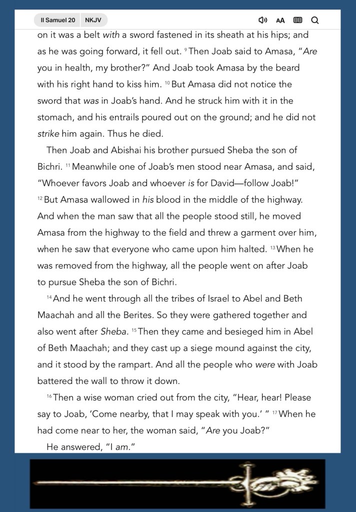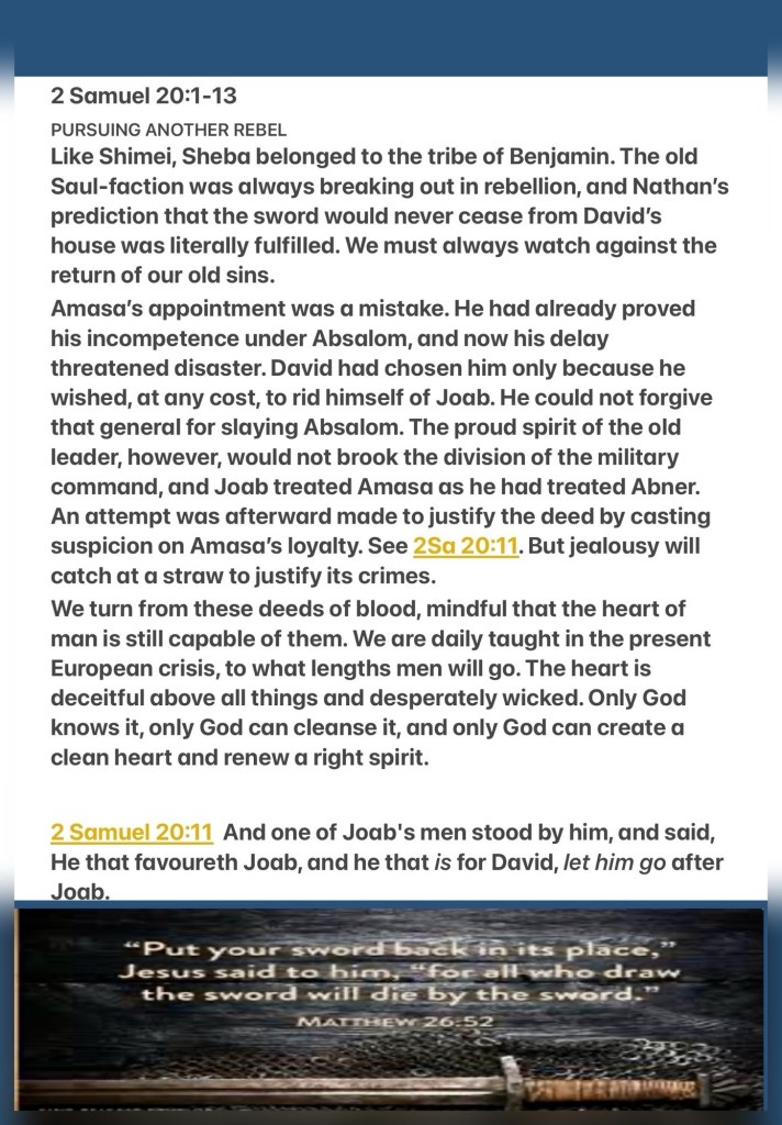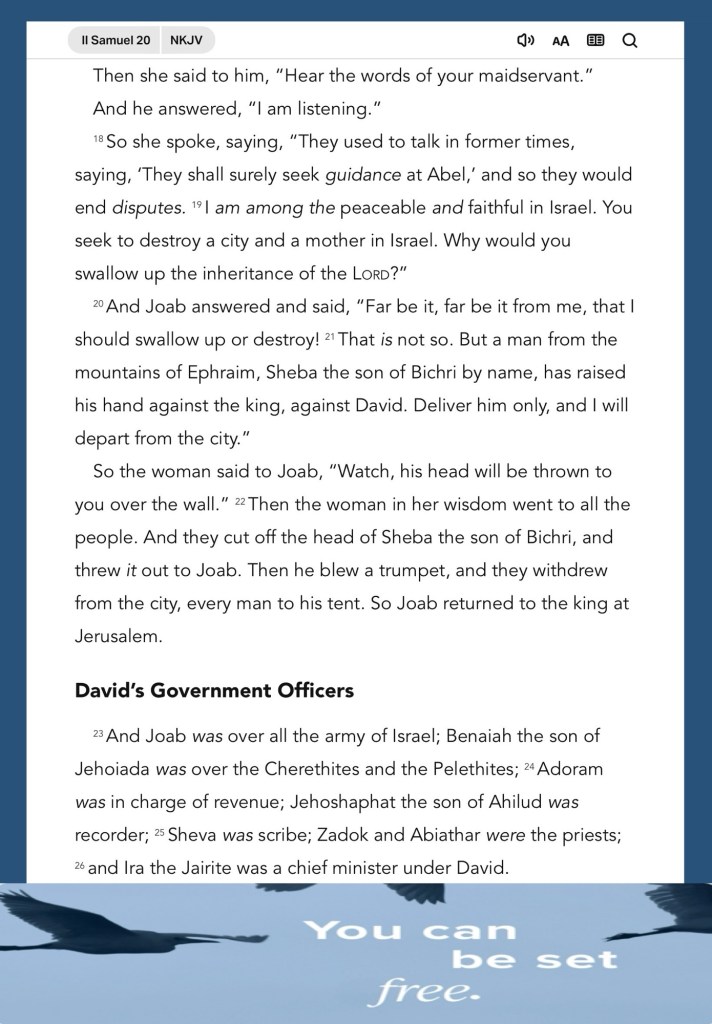 Today’s lesson 2 Samuel 20/24, today’s verses: “While they promise them liberty, they themselves are slaves of corruption; for by whom a person is overcome, by him also he is brought into bondage.” II Peter 2:19 “that if you confess with your mouth the Lord Jesus and believe in your heart that God has raised Him from the dead, you will be saved.” Romans 10:9