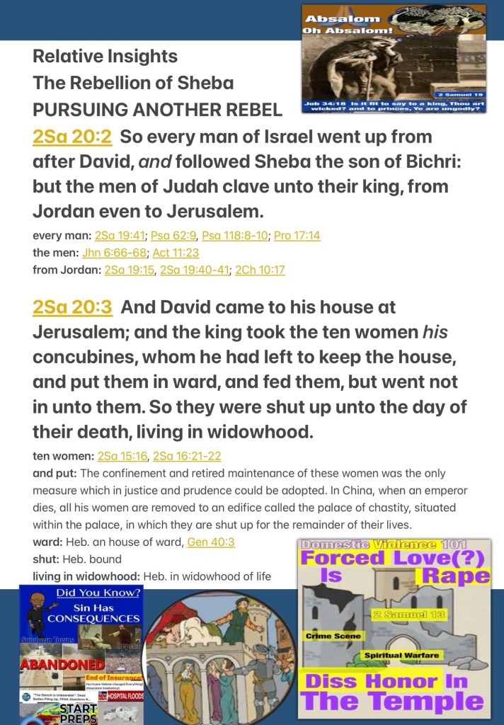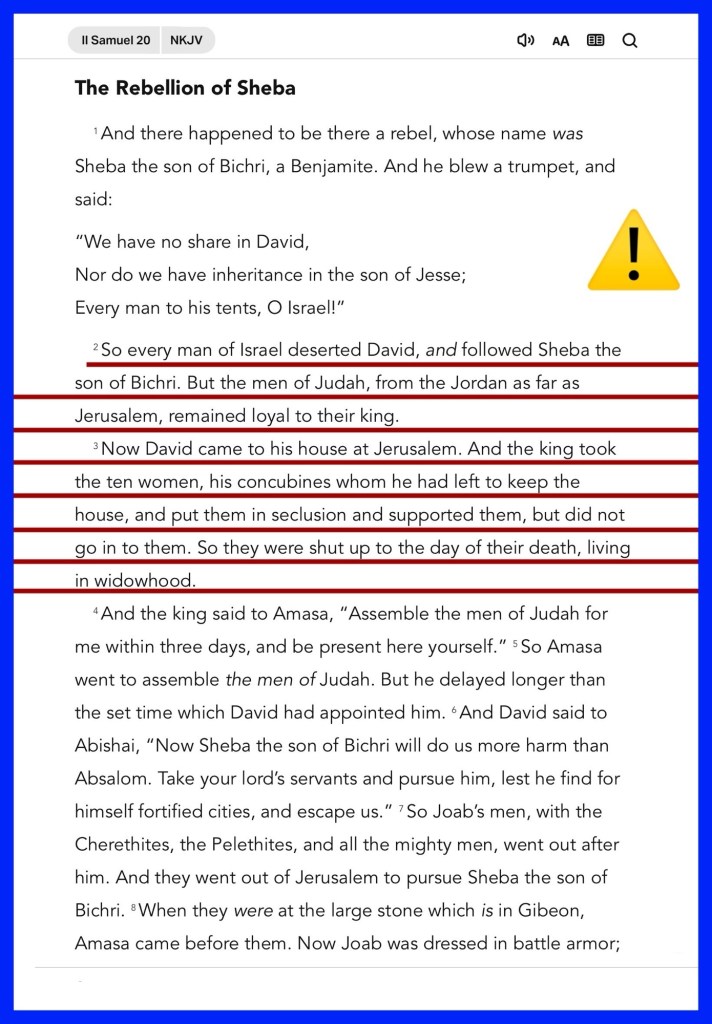 “So every man of Israel deserted David, and followed Sheba the son of Bichri. But the men of Judah, from the Jordan as far as Jerusalem, remained loyal to their king. Now David came to his house at Jerusalem. And the king took the ten women, his concubines whom he had left to keep the house, and put them in seclusion and supported them, but did not go in to them. So they were shut up to the day of their death, living in widowhood.” II Samuel 20:2-3