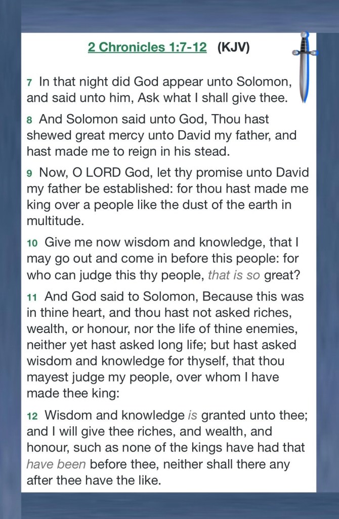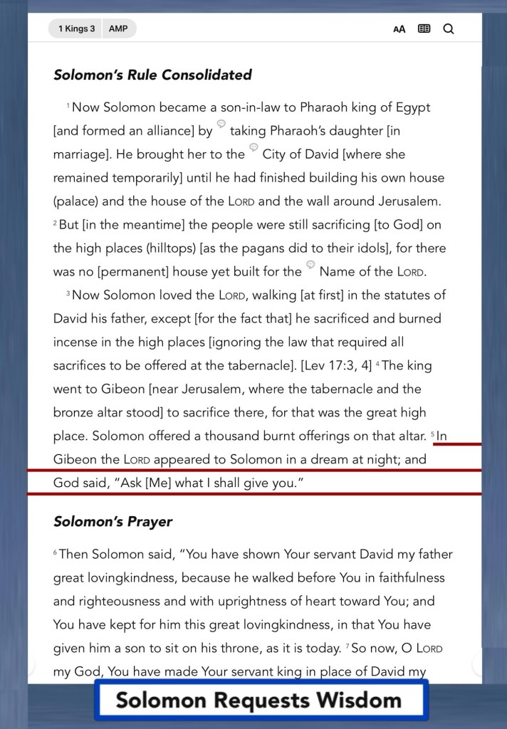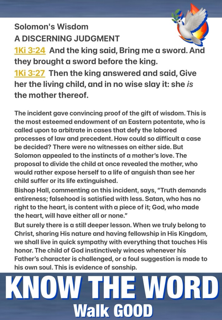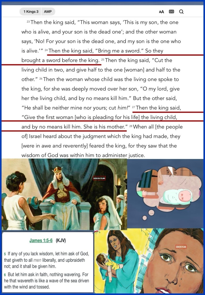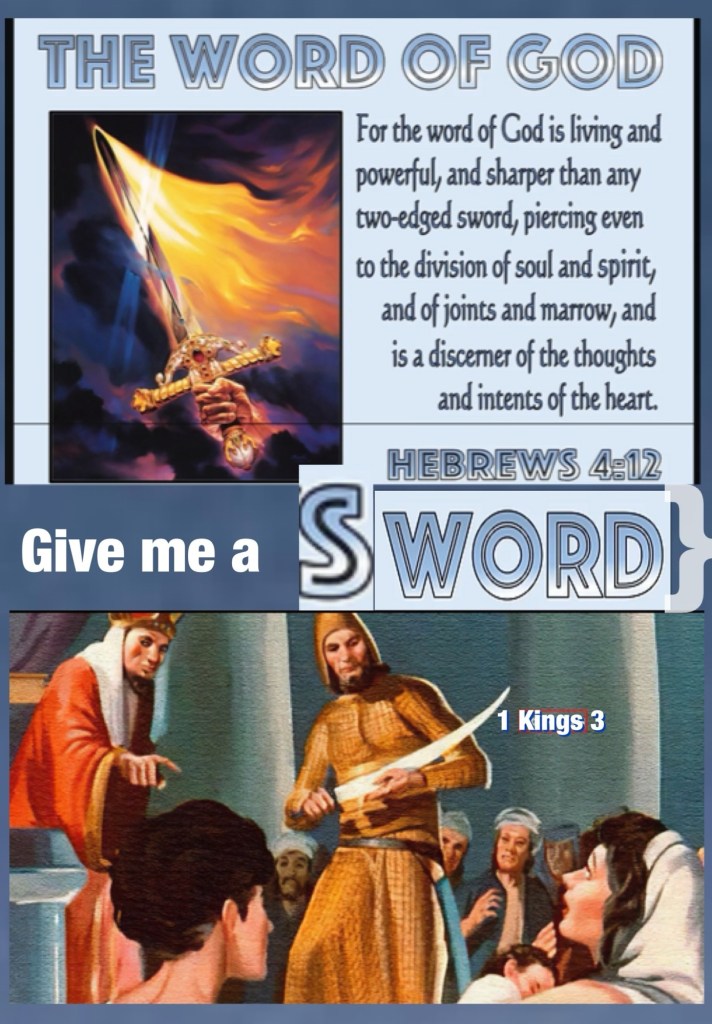 “At Gibeon THE LORD appeared to Solomon in a dream by night; and GOD said, “Ask! What shall I give you?” … Then the king said, “Bring me a SWORD” So they brought a Sword before the king. … So the king answered and said, “Give the first woman the living child, and by no means kill him; she is his mother.”” I Kings 3:5, 24, 27