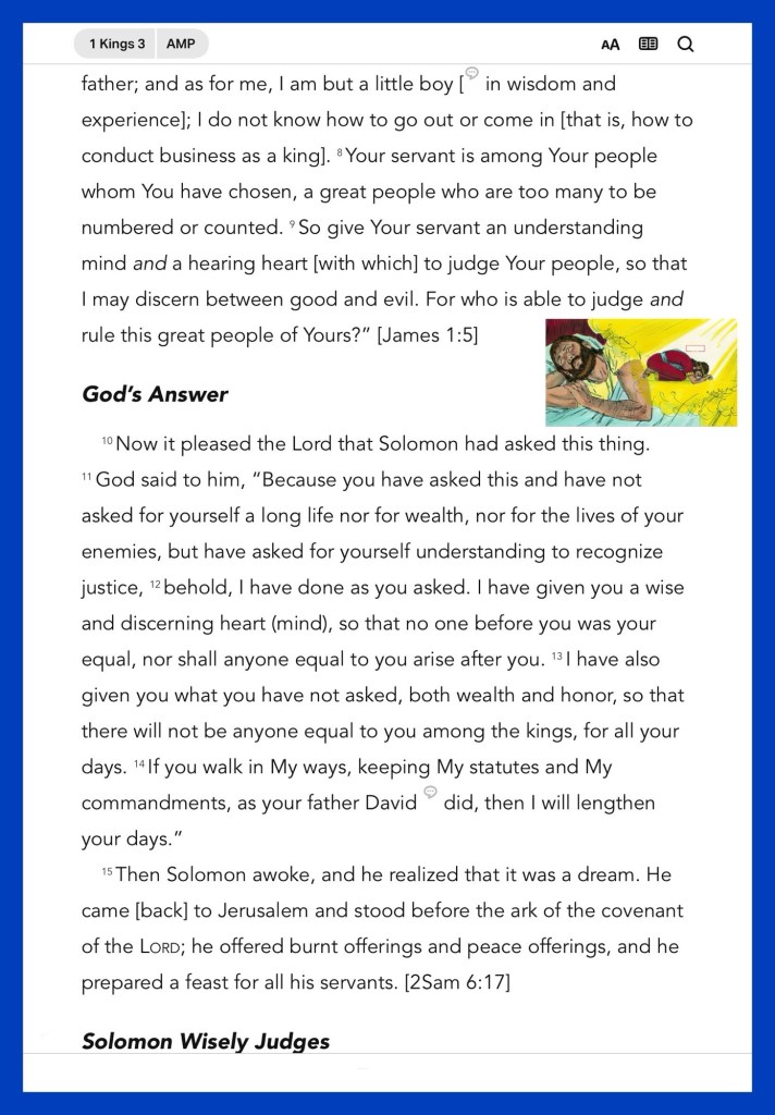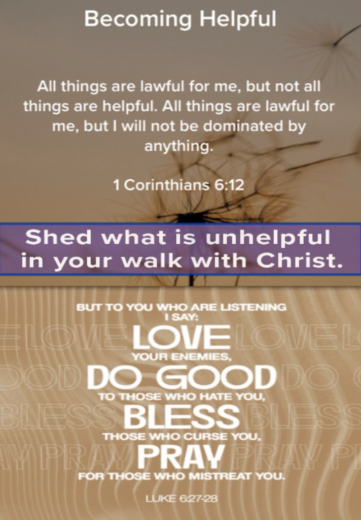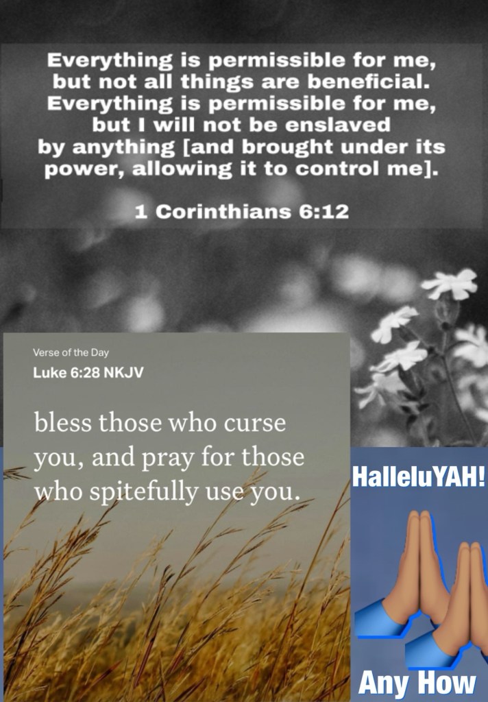 Today’s lesson 1 Kings 3/22, today’s verses: “All things are lawful for me, but all things are not helpful. All things are lawful for me, but I will not be brought under the power of any.” I Corinthians 6:12 “bless those who curse you, and pray for those who spitefully use you.” Luke 6:28
