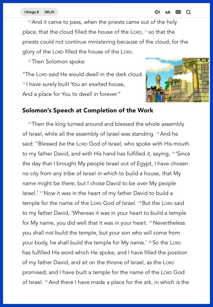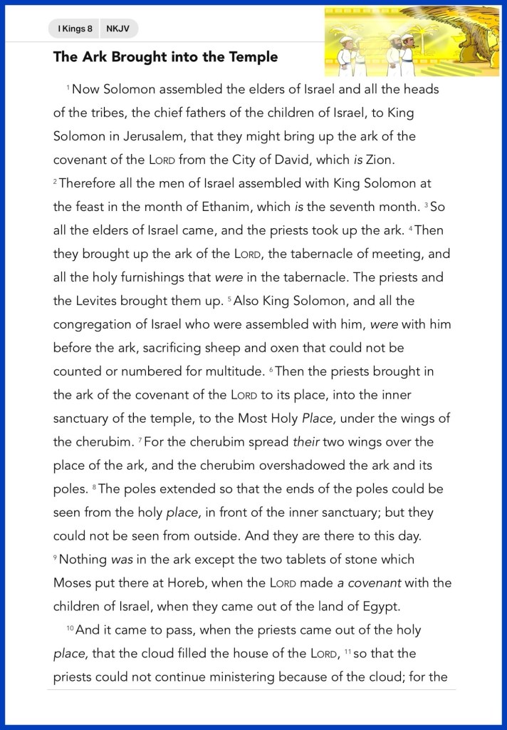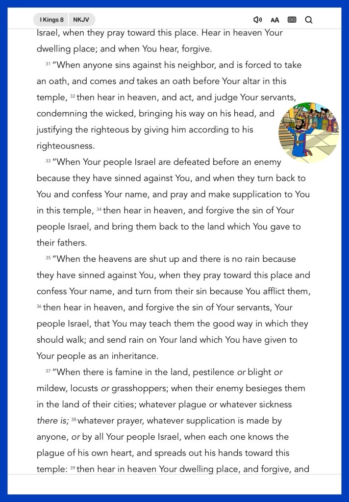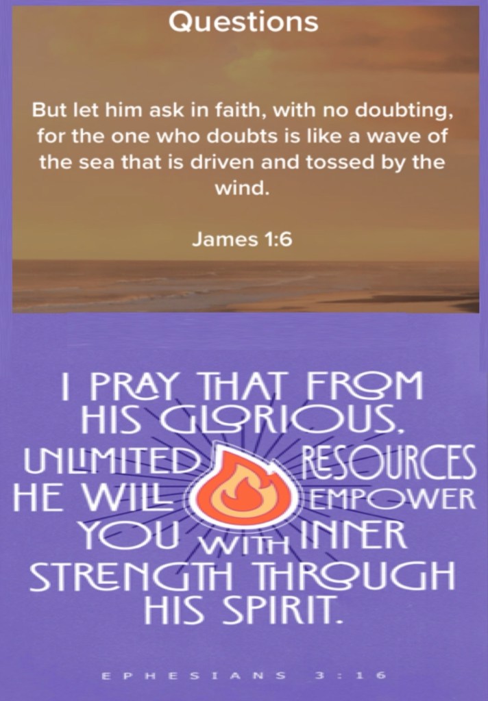 Today’s lesson 1 Kings 8/22, today’s verses: “But let him ask in faith, with no doubting, for he who doubts is like a wave of the sea driven and tossed by the wind.”James 1:6 “that He would grant you, according to the riches of His glory, to be strengthened with might through His Spirit in the inner man,” Ephesians 3:16