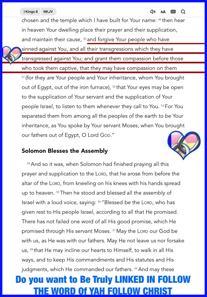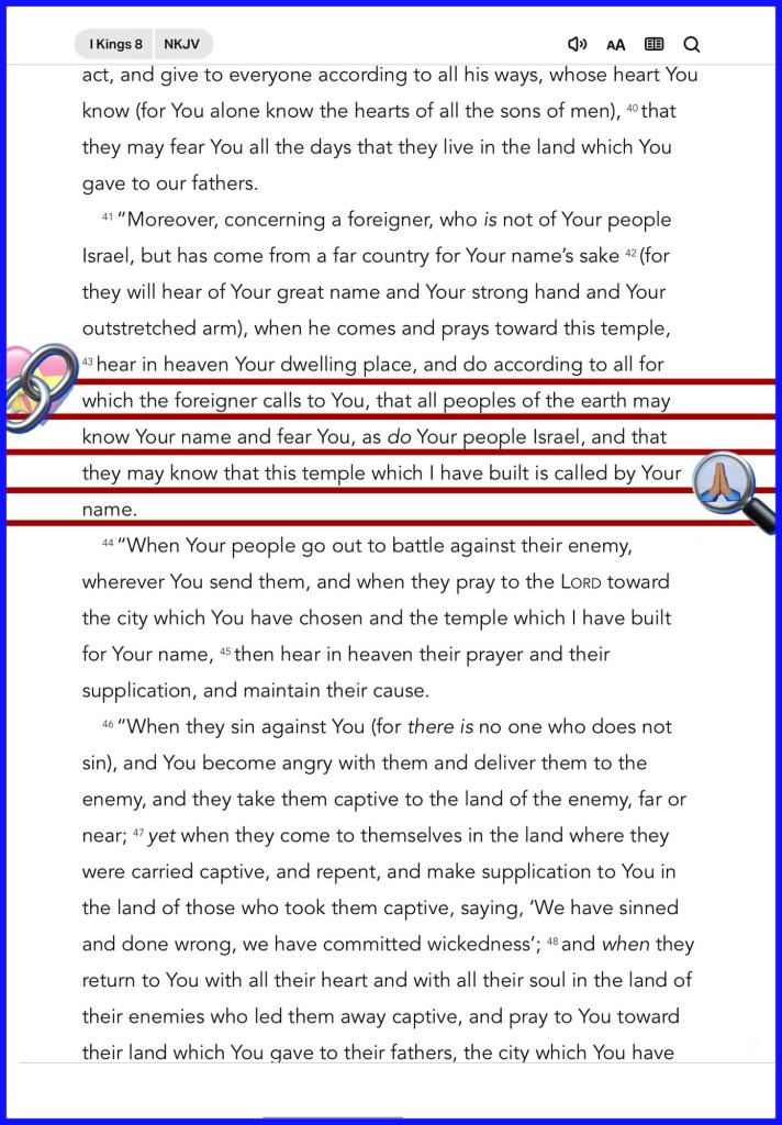 “hear in heaven Your dwelling place, and do according to all for which the foreigner calls to You, that all peoples of the earth may know Your name and fear You, as do Your people Israel, and that they may know that this temple which I have built is called by Your name. and forgive Your people who have sinned against You, and all their transgressions which they have transgressed against You; and grant them compassion before those who took them captive, that they may have compassion on them” I Kings 8:43, 50