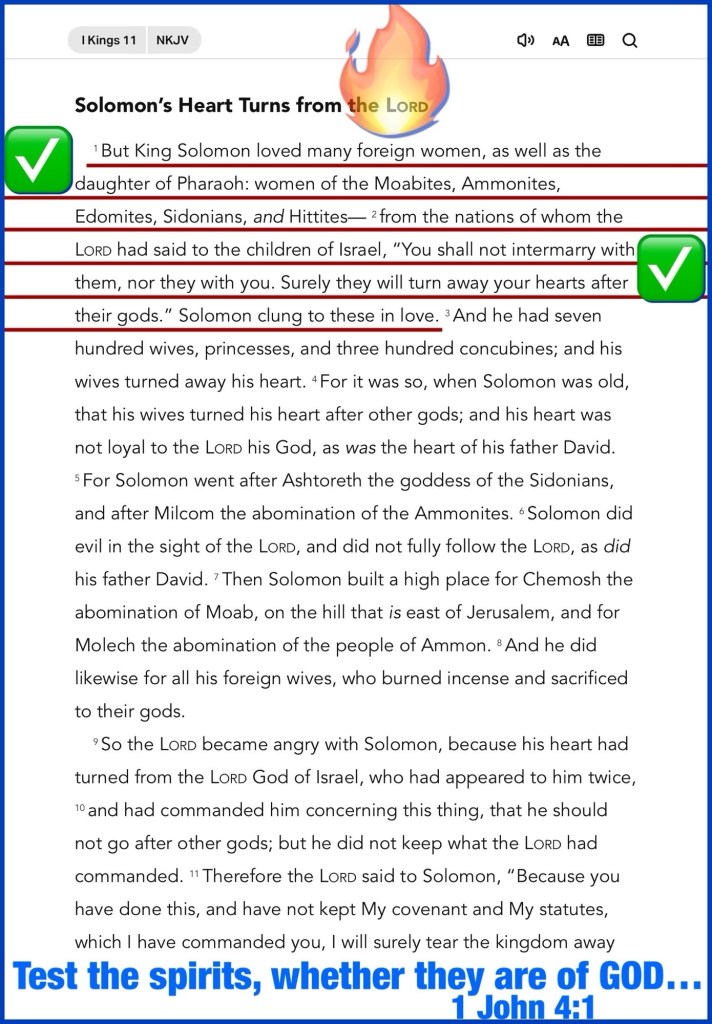 “But King Solomon loved many foreign women, as well as the daughter of Pharaoh: women of the Moabites, Ammonites, Edomites, Sidonians, and Hittites— from the nations of whom the Lord had said to the children of Israel, “You shall not intermarry with them, nor they with you. Surely they will turn away your hearts after their gods.” Solomon clung to these in love. because they have forsaken Me, and worshiped Ashtoreth the goddess of the Sidonians, Chemosh the god of the Moabites, and Milcom the god of the people of Ammon, and have not walked in My ways to do what is right in My eyes and keep My statutes and My judgments, as did his father David.” I Kings 11:1-2, 33