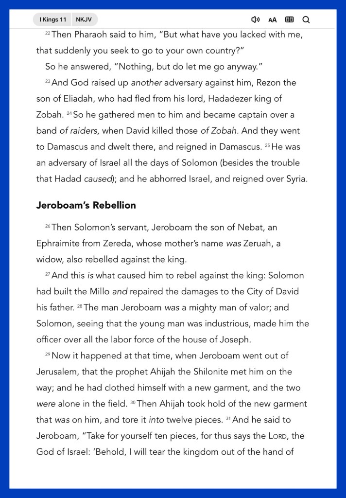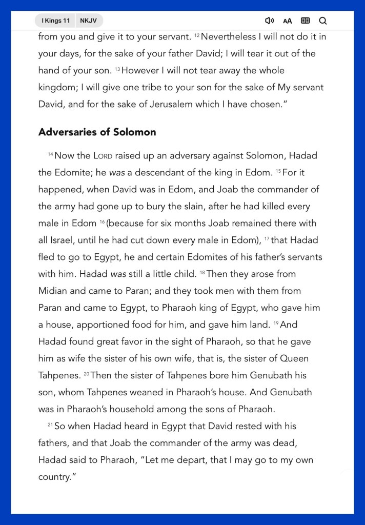 Today’s lesson 1 Kings 11/ 22, today’s verses: ““You have heard that it was said, ‘An eye for an eye and a tooth for a tooth.’ But I tell you not to resist an evil person. But whoever slaps you on your right cheek, turn the other to him also.” Matthew 5:38-39 “For do I now persuade men, or God? Or do I seek to please men? For if I still pleased men, I would not be a bondservant of Christ.” Galatians 1:10