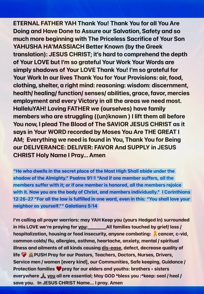 Greetings BeLoved child of THE MOST HIGH EL SHADDAI THE KING Of PEACE, BLESSINGS, AGAPÈ LOVE And much, much more HalleluYAH! An Appointment With EL SHADDAI Is likely life changing and it’s as simple as taking that moment to Pray, Praise, Worship and Inquire of our Loving ALMIGHTY FATHER GOD 24/7/365 you’re Always welcome YHWH Is Always Listening and Available “And Shelomoh went up there to the bronze slaughter-place before יהוה, which was at the Tent of Appointment, and offered a thousand ascending offerings on it. That night Elohim appeared to Shelomoh, and said to him, “Ask what should I give you!”” Diḇre haYamim Bĕt (2 Chronicles) 1:6-7 TS2009 “God replied to Solomon, “Because this was in your heart and you did not ask for riches, possessions or honor and personal glory, or the life of those who hate you, nor have you even asked for long life, but you have asked for wisdom and knowledge for yourself so that you may rule and administer justice to My people over whom I have made you king, wisdom and knowledge have been granted you. I will also give you riches, possessions, and honor, such as none of the kings who were before you has possessed nor will those who will come after you.”” 2 Chronicles 1:11-12 AMP How wonderful when our prayers line up with YAH’S Will: this is where miracles happen; so go ahead Seek THE FATHER, Sit In His Holy Presence: Receive THE HOLY SPIRIT Makeover And The Wisdom we need for the times. GOD Bless: Walk Good, Be Loved and in every way Glorify GOD HalleluYAH!