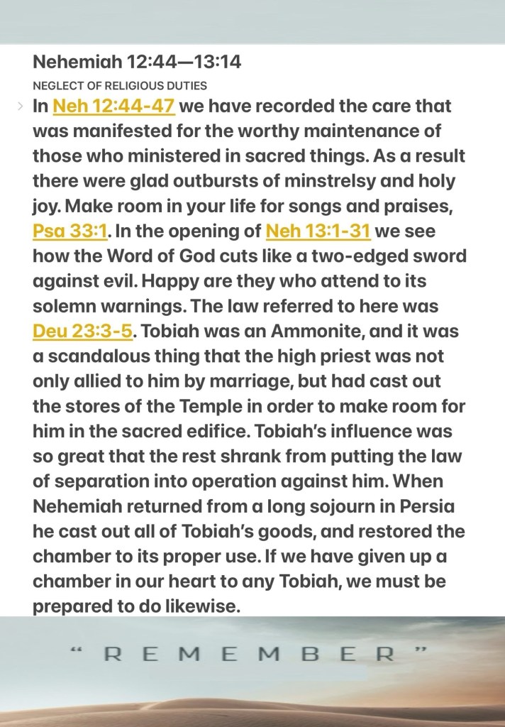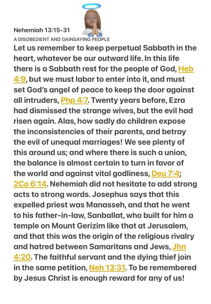 Today’s lesson Nehemiah 13/13✅🎉, today’s verses: “Then the manna ceased on the day after they had eaten the produce of the land; and the children of Israel no longer had manna, but they ate the food of the land of Canaan that year.” Joshua 5:12 “If we live in the Spirit, let us also walk in the Spirit.” Galatians 5:25