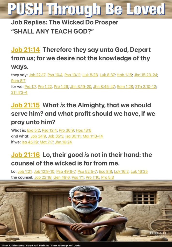 “Yet they say to God, ‘Depart from us, For we do not desire the knowledge of Your ways. Who is the Almighty, that we should serve Him? And what profit do we have if we pray to Him?’ Indeed their prosperity is not in their hand; The counsel of the wicked is far from me.” Job 21:14-16 NKJV
