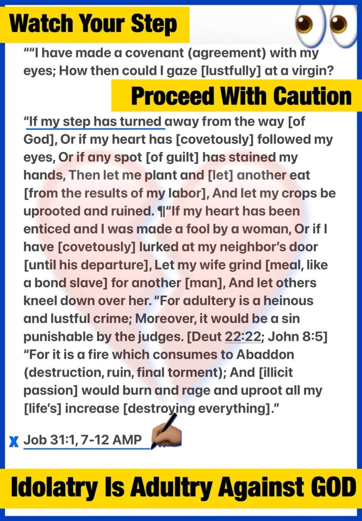 Greetings BeLoved child of THE MOST HIGH GOD YAH ELOHIM: THE AUTHOR ✍🏽: THE CREATOR: THE WORD: OMNIPOTENT, OMNISCIENT, OMNIPRESENT PROVIDER: our FAITHFUL HEALER, JUDGE JUSTICE DEFENSE, SAVIOR our HELP In Times of Need, LOVE ALWAYS And In All Righteous Ways THE GREAT I AM… are you “Thirsty”? He’s your Life Sustaining Drink, are you “Hungry”? He’s THE BREAD OF LIFE, are you lost? He’s YHWH ELOHIM: “Jesus {*יהושע] said to him,❤️ “I am the [only] Way [to God] and the [real] Truth and the [real] Life; no one comes to the Father but through Me.” John 14:6 [AMP, *TS2009] Doth notH3808 heH1931 seeH7200 my ways,H1870 and countH5608 allH3605 my steps?H6806 [Job 31:4 KJV] 🔍 YAH SEES KNOWS PROVIDES Believe it or not (yet) because GOD IS GOD All by Himself with No input from any of us whether we know Him or not 24/7/365 CHRIST COVERAGE Is available to All creation in AGAPÈ LOVE Fashion and BeLoved All we need to do Is Receive Him as a child of GOD In CHRIST we can proclaim “The lines have fallen to me in pleasant places; Yes, I have a good inheritance.”Psalms 16:6 “casting all your care upon Him, for He cares for you.” I Peter 5:7 👀 ✍🏽What if you have a different type of hunger and a different type of thirst? Something to satisfy your flesh? This is likely still spiritual warfare regardless how you are feeling, Consider the words, thoughts and actions of Job as he weighs the actions and consequences throughout this book but especially in this 31st chapter [*see Deuteronomy 28 Blessings and Curses] and repeat after me GOD Looks Upon us With LOVE: YAH SEES KNOWS PROVIDES. If you truly want to live to Honor GOD you will consider the lives of Job, Joseph, JESUS and know: “No temptation has overtaken you except such as is common to man; but God is faithful, who will not allow you to be tempted beyond what you are able, but with the temptation will also make the way of escape, that you may be able to bear it.” I Corinthians 10:13 HEED THE WORD, LOVE LIKE CHRIST, THE COMMANDMENTS: COVENANT: VOW: LOVE With Intention, Remember What Was Done To Save You, Your Test Will Be Your Testimony Give GOD THE GLORY, PUSH Through Be Loved HalleluYAH! Have a great rest of your day; May GOD BLESS And KEEP You CHRIST COMMITTED Repentant Redeemed A Ready Bride (Body Of Believers)⏳⚖️⌛️