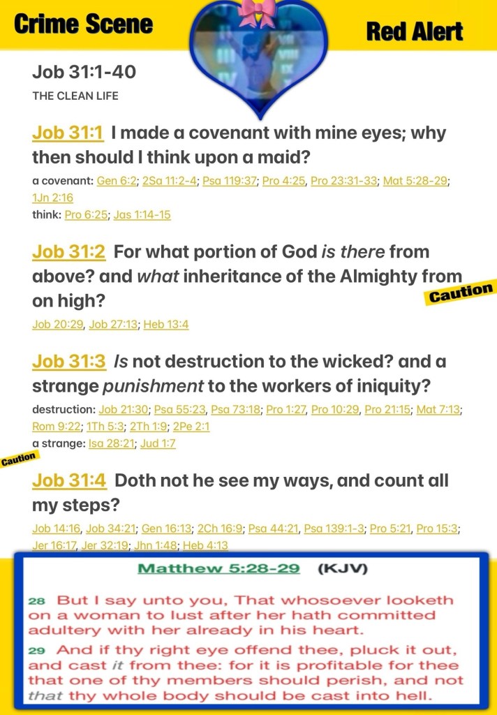 ““I have made a covenant with my eyes; Why then should I look upon a young woman? For what is the allotment of God from above, And the inheritance of the Almighty from on high? Is it not destruction for the wicked, And disaster for the workers of iniquity?” Job 31:1-3 NKJV