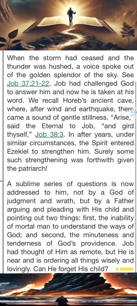 Today’s lesson Job 38 /42, today’s verses: “Then you will call upon Me and go and pray to Me, and I will listen to you. And you will seek Me and find Me, when you search for Me with all your heart. I will be found by you, says the Lord, and I will bring you back from your captivity; I will gather you from all the nations and from all the places where I have driven you, says the Lord, and I will bring you to the place from which I cause you to be carried away captive.” Jeremiah 29:12-14 “The people who walked in darkness Have seen a great light; Those who dwelt in the land of the shadow of death, Upon them a light has shined.” Isaiah 9:2 ❤️ “While I was with them in the world, I kept them in Your name. Those whom You gave Me I have kept; and none of them is lost except the son of perdition, that the Scripture might be fulfilled.” John 17:12 “And God will wipe away every tear from their eyes; there shall be no more death, nor sorrow, nor crying. There shall be no more pain, for the former things have passed away.”” Revelation 21:4