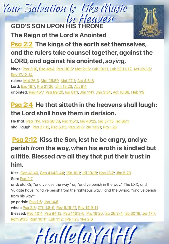 Greetings BeLoved child of THE MOST HIGH GOD YAH ELOHIM: THE CREATOR: THE COMMANDER: THE KING Of Kings: THE WORD: THE ONE WHO IS ABLE: THE GREAT I AM… Please Take Heed ⚠️ Listen Up: “The sovereigns of the earth take their stand, And the rulers take counsel together, Against יהוה and against His Messiah, and say, He who is sitting in the heavens laughs, יהוה mocks at them. Kiss the Chosen, lest He be enraged, And you perish in the way, For soon His wrath is to be kindled. Blessed are all those taking refuge in Him.” Tehillim (Psalms) 2:2, 4, 12 TS2009 {https://bible.com/bible/316/psa.2.2-12.TS2009] “And when He had removed him, He raised up for them David as king, to whom also He gave testimony and said, ‘I have found David the son of Jesse, a man after My own heart, who will do all My will.’” Acts 13:22 “Let no one despise your youth, but be an example to the believers in word, in conduct, in love, in spirit, in faith, in purity.” I Timothy 4:12. 🙌🏼 GLORY Be To THE MOST HIGH GOD יהוה what a Blessing it is that He has extended our breath another day, I’m keeping in Prayer our brothers and sisters experiencing illness: dis-ease of all kinds and for every one mourning loss of all kinds let us Bring their case(s) before our Heavenly FATHER while Pleading The Blood Of THE LAMB; Salvation Is Crucial may the only death be to self and our souls Be Immersed: Fully Baptized By THE RUACH HA’QUODESH: THE HOLY SPIRIT; And GODLY GLORY Of LOVE: Repentance And Forgiveness Be What Remains: Be CHRIST COMMITTED —> CHRIST COVERED —> CHRIST CONFIDENT And GLORIOUS: Listen Up we are living in the last days of earth’s history (as well as our own) on Probationary Preparation Period known as Life and everything we do amounts to a spiritual Choice: For or Against GOD; Please Learn the metaphors and life skills applications contained throughout THE WORD Take Refuge in Him; Be Healed, Sealed, Made Whole: Holy: Bearing The Image Of ABBA YAH: CHRIST JESUS: THE REDEEMER And Soon Coming KING. HalleluYAH! Get Ready: Regular Bible Study Helps; Stay Ready: Keep CHRIST CONNECTED, Walk Good: FOLLOW YHWH, Be Loved: Favored By GOD🥰 Have an Awesome Day Romans 10:11 For the scripture saith, Whosoever believeth on him shall not be ashamed.