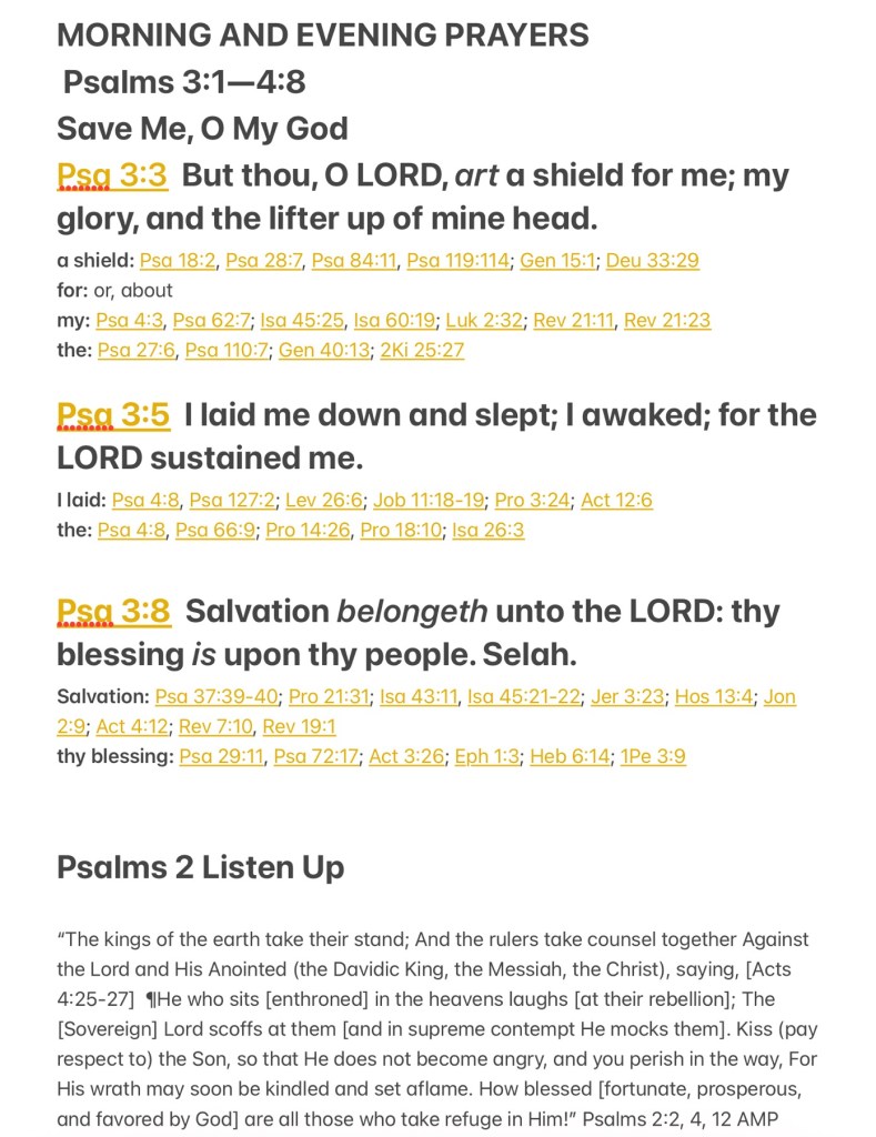 “But You, O Lord, are a shield for me, My glory and the One who lifts up my head. I lay down and slept; I awoke, for the Lord sustained me. Salvation belongs to the Lord. Your blessing is upon Your people. Selah” Psalms 3:3, 5, 8 NKJV