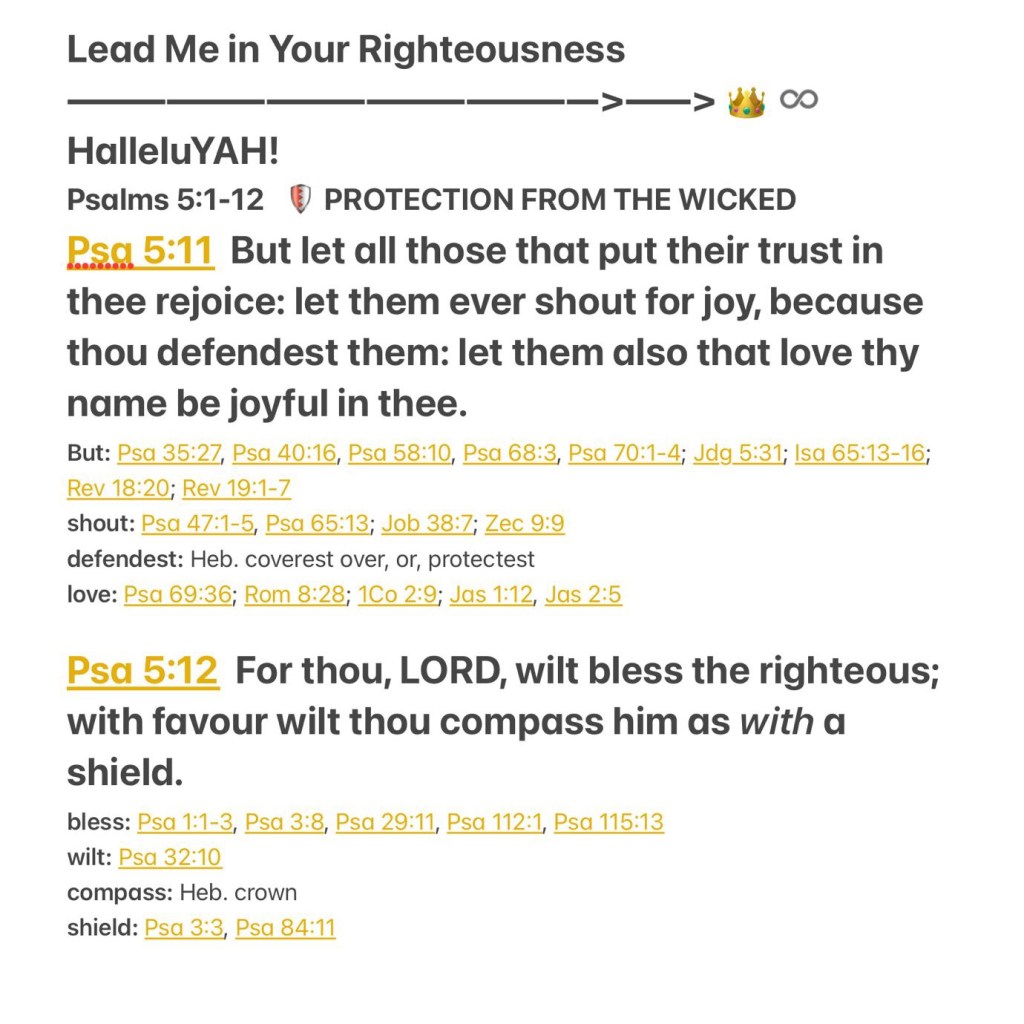 Greetings BeLoved child of THE MOST HIGH GOD YAH ELOHIM: THE AUTHOR ✍🏽: THE CREATOR: THE WORD OMNIPOTENT, OMNISCIENT, OMNIPRESENT ADVOCATE EMMANUEL: GOD With us, THE COMFORTER: THE COVER: THE GREAT I AM… you are Favored and CHRIST COVERED dear beautiful child please personalize and hear this straight from The Heart Of your Heavenly FATHER to you: “But let all those that put their trust in [YAHUAH} thee rejoice: Let them ever shout for joy, because [YAH} thou defendest them: let them also that love thy name {Shêm: Character] be joyful in [YHWH} thee. For thou, LORD {YAHUSHA], wilt bless the righteous; With favour wilt [YAH EMMANUEL} thou compass him as with a shield.” Psalm 5:11-12 KJV ““Although my house is not so with God, Yet He has made with me an everlasting covenant, Ordered in all things and secure. For this is all my salvation and all my desire; Will He not make it increase?” II Samuel 23:5 “But thanks be to God, who gives us the victory through our Lord Jesus Christ.” I Corinthians 15:57 KEEP THE WORD: BE 😇 CHRIST COVERED🥰: DRESSED IN LOVE. Thank you for journeying through in this part of The Holy Scriptures Be BLESSED