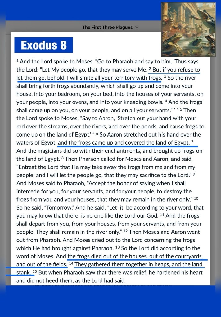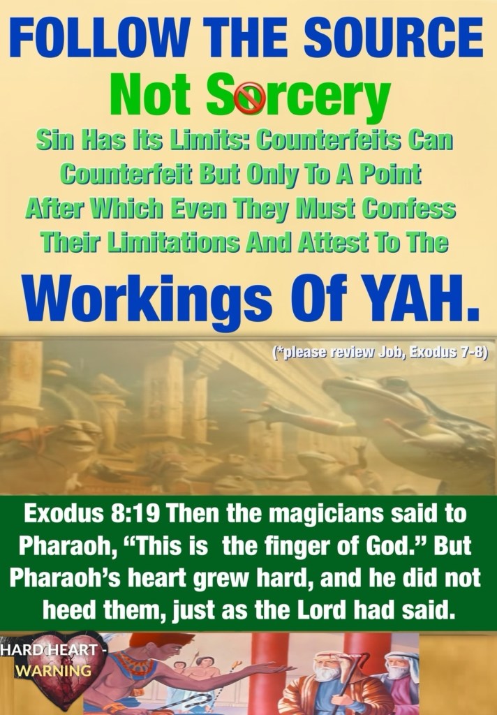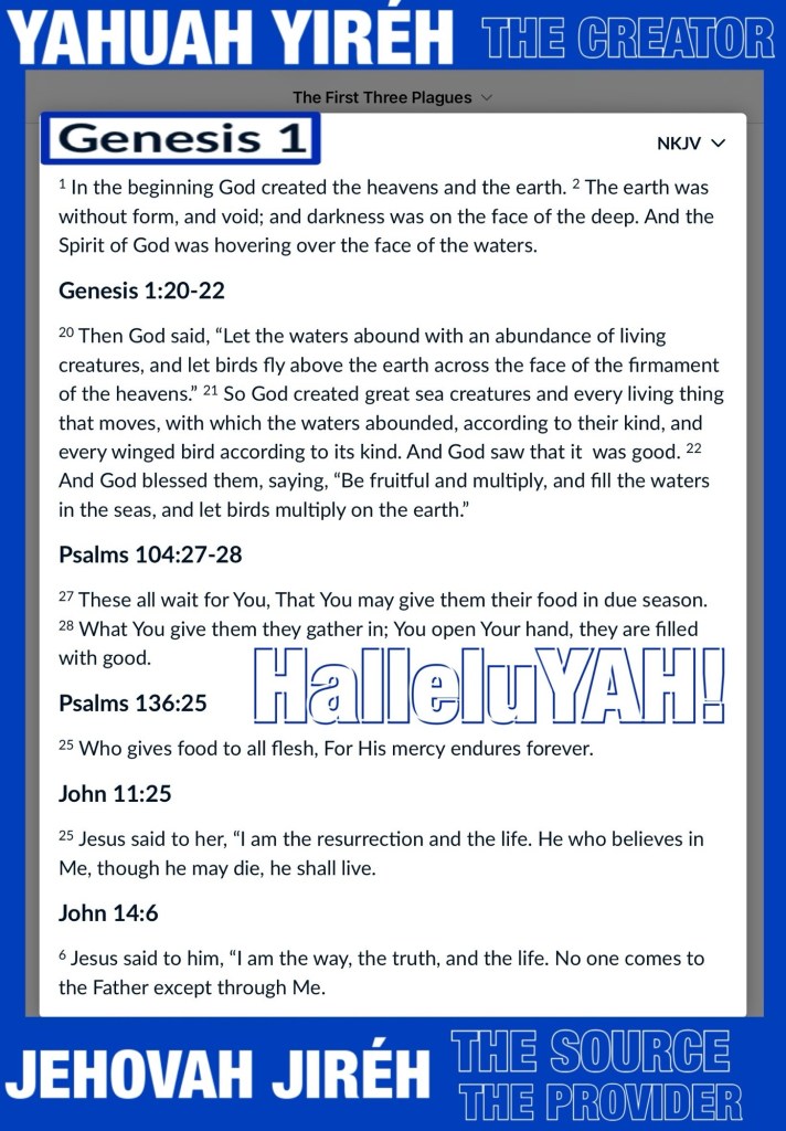 Greetings BeLoved child of THE MOST HIGH GOD YAH יהוה ELOHIM: THE CREATOR FATHER YAH THE WORD: THE AUTHOR ✍🏽: of our hearts beats: CONTINUOUS REFUGE: OMNIPOTENT, OMNIPRESENT, OMNISCIENT: PEACE: REST: SALVATION PURPOSE AGAPÈ LOVE: DELIVERANCE: CHRIST 🩸COVERAGE: ETERNAL GLORY THE RUACH HA’QUODESH: THE HOLY SPIRIT: THE INSTRUCTOR YHWH ELOHIM DIRECTOR Of Life Now And Forever: THE COMMANDER: THE GREAT I AM: THE HEDGE OF PROTECTION: THE RIGHTEOUS REDEEMER: SUSTAINER: THE BREAD AND THE FOUNTAIN OF LIFE: THE SOURCE: Rest In YAH, Do Not Fret! I AM THAT I AM. THE SOURCE Of What Is Plaguing You: Hard vs Repentant Heart … Daily GOD Spares Life: Grants us Air to breathe: Functional bodies and minds All of which we should give Praise Worship for His FAITHFUL LOVE FAVOR GRACE DELIVERANCE; self reflection while Counting our Blessings will keep us Penitent, Humble and Guard Against Developing an Unthankful Hardened Heart this is the primary difference between big bro. David and Pharoh (*please review Exodus 7-8). David Knew YAH As his SOURCE (GOD) “For my iniquities have gone over my head [like the waves of a flood]; As a heavy burden they weigh too much for me. My wounds are loathsome and foul Because of my foolishness. My loved ones and my friends stand aloof from my plague; And my neighbors stand far away. [Luke 23:49] For in You, O Lord, I hope; You will answer, O Lord my God. Make haste to help me, O Lord, my Salvation.” Psalms 38:4-5, 11, 15, 22 AMP David was surrendering All to CHRIST in his moments of Storm or Crisis; whereas Mr Pridefilled Self Reliant Pharoh regarded himself as a “god” and worshipped several “things” as god, which made him uniquely qualified to Be Humbled By GOD. You cannot Choose how you get humbled just know that stubborn pride takes longer to evacuate (it took 7 years for Nebbuchadnezzer *Daniel 4:33) [From SSL: Read Exodus 7:14–8:19. What happened in these plagues? The ten plagues in Egypt were aimed not at the Egyptian people but at their gods. Each plague hit at least one of them.] We are living in a time of serious spiritual warfare dealing with The Side Effects of sin, and if we Know nothing we Better Know our GOD: THE SOURCE: LIFE: LOVE: THE WAY: THE WORD And HEED HIM. Pray THE HOLY SPIRIT Will Indwell you with All you need as well as Wisdom Discernment and a Heart Sensitive To His WORD The Holy Scriptures. Remember Job there’s always more to the story; Prayer and Bible Study is CPR for your soul. THE SOURCE Of What Is Plaguing You: Hard vs Repentant Heart, can be revealed in a crisis Who do you turn to? Not everything that happens is an “Act Of GOD” several calamities: chaos: crisis are the acts of “the small g counterfeit gods of the same name” 🤔 Everything is spiritual and A crisis is the right time to Turn or Return to JESUS CHRIST. I’m Praying for our healing ❤️🩹 in all the ways we need most (salvation: deliverance…) and for us to Be Obvious children Of EL SHADDAI; LIVE IN HIS LOVE: Take Care Walk Good Be Loved