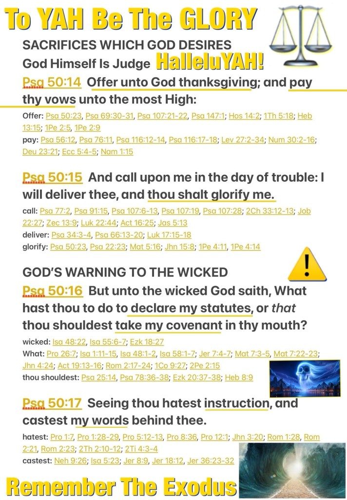 “Offer to God thanksgiving, And pay your vows to the Most High. Call upon Me in the day of trouble; I will deliver you, and you shall glorify Me.” But to the wicked God says: “What right have you to declare My statutes, Or take My covenant in your mouth, Seeing you hate instruction And cast My words behind you?” Psalms 50:14-17 NKJV