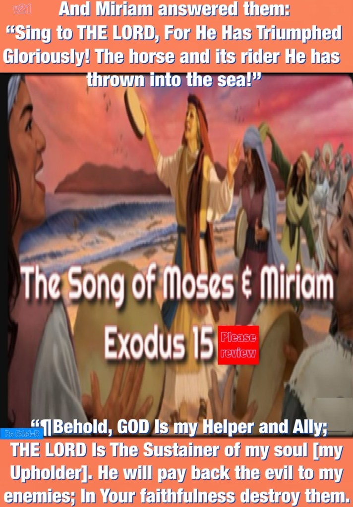Please review Exodus 15:1-21 The Song Of Moses 🎶 21 And Miriam answered them: “Sing to the Lord, For He has triumphed gloriously! The horse and its rider He has thrown into the sea!” 🙌🏼 “¶Behold, God is my helper and ally; The Lord is the sustainer of my soul [my upholder]. He will pay back the evil to my enemies; In Your faithfulness destroy them. ¶With a freewill offering I will sacrifice to You; I will give thanks and praise Your name, O Lord, for it is good. For He has rescued me from every trouble, And my eye has looked with satisfaction (triumph) on my enemies.” Psalms 54:4-7 AMP