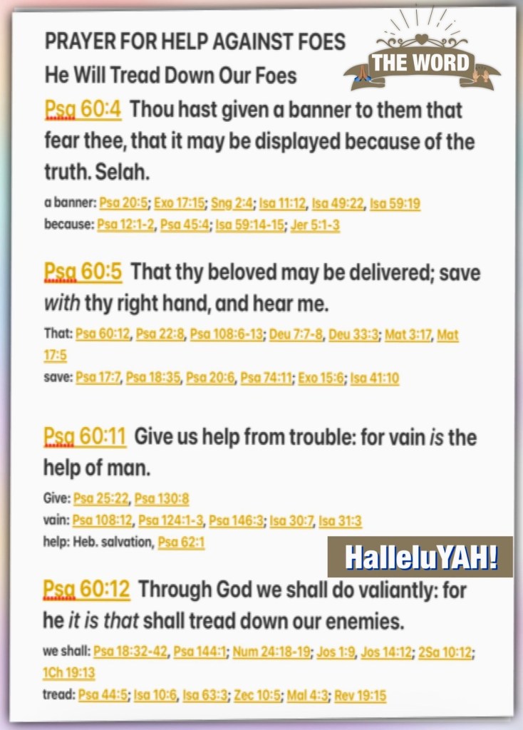 “You have given a banner to those who fear You, That it may be displayed because of the truth. Selah That Your beloved may be delivered, Save with Your right hand, and hear me. Give us help from trouble, For the help of man is useless. Through God we will do valiantly, For it is He who shall tread down our enemies.” Psalms 60:4-5, 11-12 NKJV
