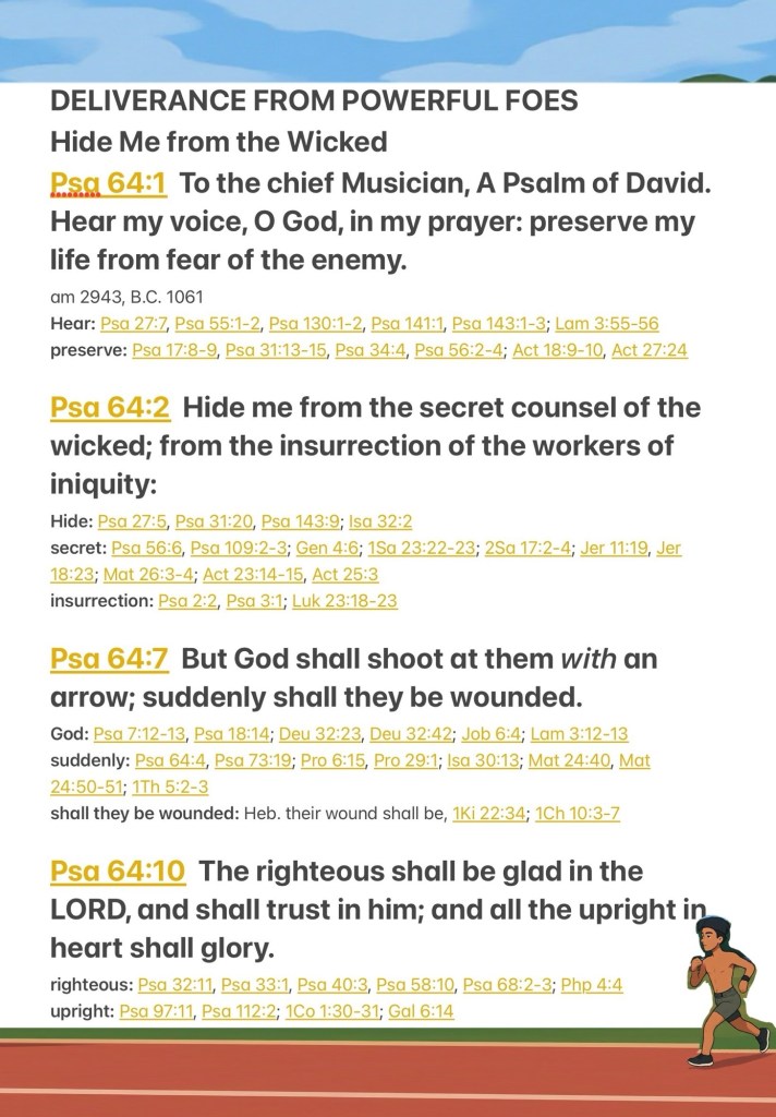 “Hear my voice, O God, in my complaint; Guard my life from the terror of the enemy. Hide me from the secret counsel and conspiracy of the ungodly, From the scheming of those who do wrong, ¶But God will shoot them with an [unexpected] arrow; Suddenly they will be wounded. The righteous will rejoice in the Lord and take refuge in Him; All the upright in heart will glory and offer praise.” Psalms 64:1-2, 7, 10 AMP