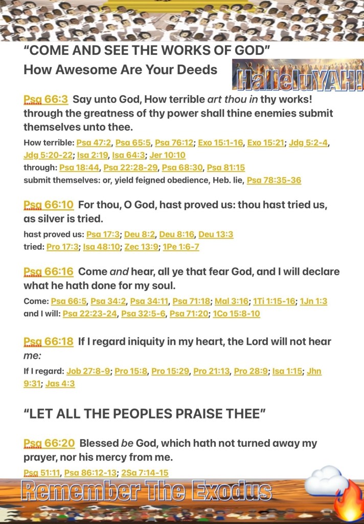 Greetings BeLoved child of THE MOST HIGH YAH ELOHIYM: THE CREATOR: THE SUPREME RIGHTEOUS JUDGE: THE ONLY ACCEPTABLE SACRIFICE: THE WORD: THE AUTHOR ✍🏽:of our heartbeat: THE COMMANDER ⚖️ THE LAW: THE VOW: AGAPÈ LOVE: FAVOR: MERCY: LOVINGKINDNESS: LOVING-COMMITMENT: I AM THAT I AM: 🆘 EL H410 (Strong). אֵל ‘êl ale Shortened from H352; strength; as adjective mighty; especially the Almighty (but used also of any deity): – God (god), X goodly, X great, idol, might (-y one), power, strong. Compare names in “-el.” HalleluYAH! GOD Is Worthy Of Worship And Worthy To Be Praised. On your Daily journey, whether we’re having a Valley or a Mountain Top Experience Please Remember “The Exodus” and HalleluYAH! Anyhow. Sometimes I have to Remind myself and “Declare What YAH Has Done For My Soul” Praise GOD! Thank You FATHER Because You Are Always my IMMANUEL (Isa 7:14, Matt. 1:23)[Exo 14-15] “Blessed be God, Who has not turned away my prayer Nor His lovingkindness from me.” Psalms 66:20 AMP “Say to God, “How awesome and fearfully glorious are Your works! Because of the greatness of Your power Your enemies will pretend to be obedient to You. For You have tested us, O God; You have refined us as silver is refined. ¶Come and hear, all who fear God [and worship Him with awe-inspired reverence and obedience], And I will tell what He has done for me. If I regard sin and baseness in my heart [that is, if I know it is there and do nothing about it], The Lord will not hear [me]; [Prov 15:29; 28:9; Is 1:15; John 9:31; James 4:3]” Psalms 66:3, 10, 16, 18 AMP “Now the mind of the flesh is death [both now and forever—because it pursues sin]; but the mind of the Spirit is life and peace [the spiritual well-being that comes from walking with God—both now and forever];” Romans 8:6 AMP “and are being justified [declared free of the guilt of sin, made acceptable to God, and granted eternal life] as a gift by His [precious, undeserved] grace, through the redemption [the payment for our sin] which is [provided] in Christ Jesus,” Romans 3:24 “Be sober [well balanced and self-disciplined], be alert and cautious at all times. That enemy of yours, the devil, prowls around like a roaring lion [fiercely hungry], seeking someone to devour.” 1 Peter 5:8 AMP Jeremiah 10:10 But the LORD is the true God, he is the living God, and an everlasting king: at his wrath the earth shall tremble, and the nations shall not be able to abide his indignation. Accept No Counterfeits or Substitutes. Be Encouraged You Are Loved And Provisions Have Been Made For You By YAH THE FATHER In CHRIST JESUS And Renewed Daily Through The Outpouring Of THE RUACH HA’QUODESH Through Whose Fruit we can Remain Just, Satisfied, Sober, Walking In Grace And Sharing CHRIST’ LOVE; LOVE Motivates Obedience: (heartfelt) Worship as we (Pray/ Praise Until Something Happens) PUSH Through unto Victory: Breakthrough: “Dry Land” in Every Area we Need It Most, HalleluYAH! May GOD BLESS, STAY With And KEEP you; Always in All your Ways Choose YHWH. Praise GOD Through This Spiritual Warfare we’re in: “Declare What YAH Has Done For (Your) My Soul” Praise GOD in the valley, Praise GOD on the mountain tops too; Praise GOD in the morning and evening In Sweet Surrender To ALMIGHTY GOD Claim His LOVE, Plead THE BLOOD 🩸 over your life. Walk Good Stay CHRIST COVERED: CONNECTED: CONVINCED: Be Loved 🥰