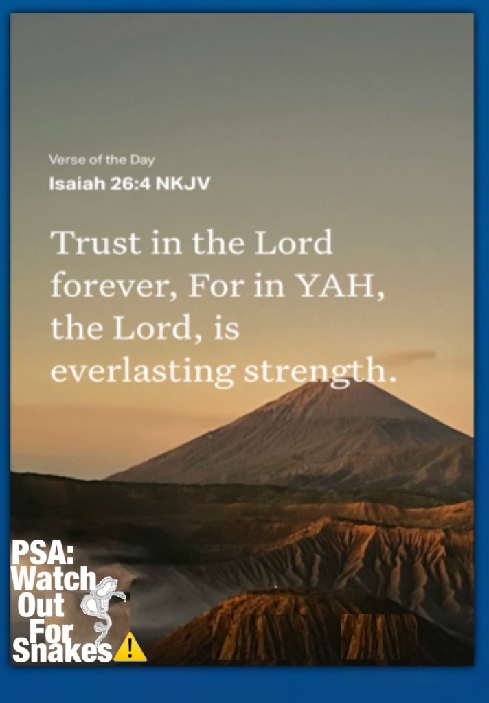 Greetings BeLoved child Of THE MOST HIGH GOD YAH ELOHIM: THE CREATOR AND AUTHOR ✍🏽:of our heartbeat: JEHOVAH JIRÈH: PROVIDER: SUSTAINER: SAVIOR: COMFORTER: EVERLASTING STRENGTH: THE ROCK OF AGES: JUDGE: JUSTICE: COUNSELOR: COVER(ING): PROTECTIVE HEDGE FORTRESS: AGAPÈ LOVE: THE WORD (I AM THAT I AM EMBODIED In The Person Of) JESUS CHRIST; our Heavenly FATHER HalleluYAH! One of my hopes is we Get To Know our FATHER His Ways: Leading: Prompting: Voice: Character(istics) so we won’t get tripped up by the enemy (counterfeit “god”/ adversary/ distractions: illness: problems: hateful convo: snakes) and see clearly the Distinction between them. Remember Spiritual Warfare Is Always At Play in this present life; Recognize Man Down: When The Poison Dart Makes Contact: CONTACT CHRIST 🆘 Psalms 37:1 A Psalm of David. Fret not thyself because of evildoers, neither be thou envious against the workers of iniquity. ✅ Check your spirit 🆘 “He who is slow to anger is better than the mighty, And he who rules his spirit than he who takes a city.” Proverbs 16:32 “Trust in the Lord forever, For in YAH, the Lord, is everlasting strength.” Isaiah 26:4 NKJV “¶When my heart was embittered And I was pierced within [as with the fang of an adder], Then I was senseless and ignorant; I was like a beast before You. Nevertheless I am continually with You; You have taken hold of my right hand. You will guide me with Your counsel, And afterward receive me to honor and glory. ¶Whom have I in heaven [but You]? And besides You, I desire nothing on earth.” Psalms 73:21-25 AMP Psalms 37:7 Rest in the LORD, and wait patiently for him: fret not thyself because of him who prospereth in his way, because of the man who bringeth wicked devices to pass. So man and woman Of GOD, these earthly test and challenges are to Strengthen you or see how long before you react in your flesh and come out of (CHRIST) Character; it’s truly a choice we can spit like a serpent or Speak Like (A Servant Of) CHRIST Remind yourself like I do often GOD Is My Strength and Portion Forever, the wicked may seem like they’re winning but try not to be bitter Be Slow to anger: Patient even with snakes and scorpions nipping at your heels, we are Solders In GOD’S Army: CHRIST FIGHTS DIFFERENTLY Surrender Only To Him otherwise PUSH Through With THE MESSIAH Confidently Give Him Charge To Lead you and Fight For you Worship Is Warfare (I’m) Praying and Praising YAH In Advance for His Victory in our day to day struggles and Ultimately The Saving of our souls. Wave The Flag Saying HalleluYAH! We are to live and look like THE FATHER; Live Through THE WORD: LIVE In His LOVE! GRACE: FAVOR: Be BLESSED: A BLESSING And A ROCK, LOVE With Intention 💗 “He who is slow to anger is better and more honorable than the mighty [soldier], And he who rules and controls his own spirit, than he who captures a city.” Proverbs 16:32 ““Trust [confidently] in the Lord forever [He is your fortress, your shield, your banner], For the Lord God is an everlasting Rock [the Rock of Ages].” Isaiah 26:4 AMP YAHUAH NISSI: JEHOVAH-NISSI: “THE LORD YAH our BANNER” Exo. 17:8,15