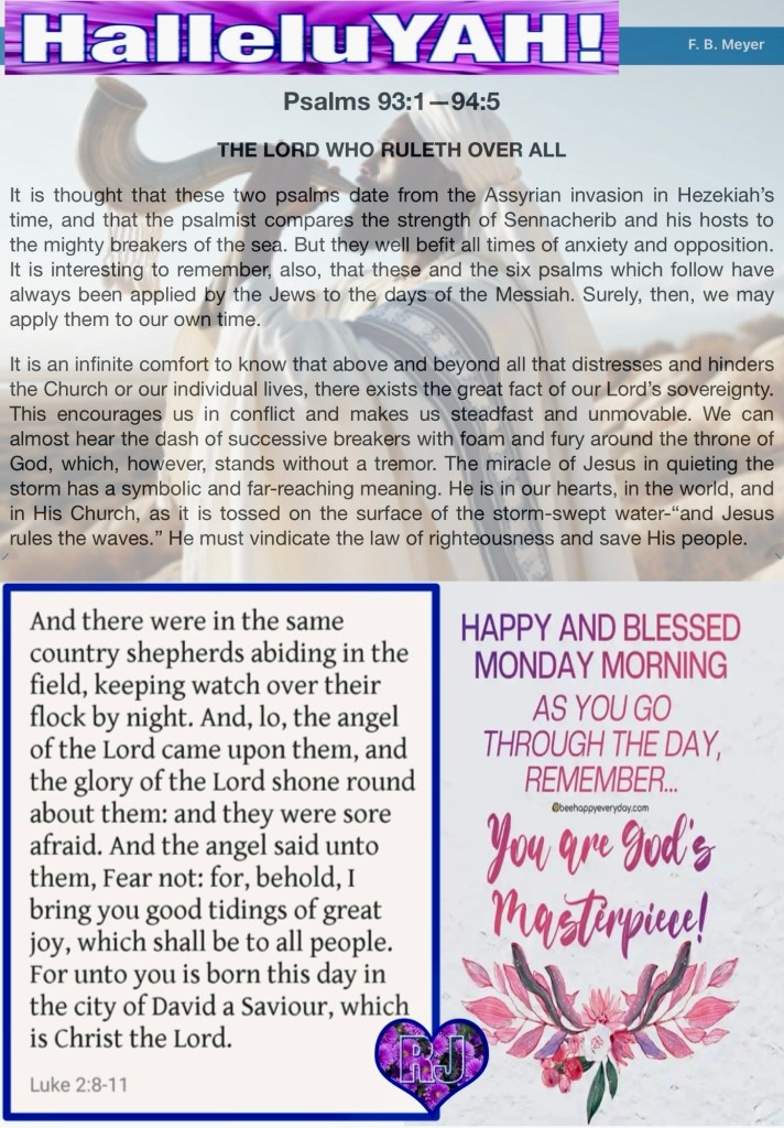 Today’s lesson Psalms 93/150, today’s verses: “Then the devil, taking Him up on a high mountain, showed Him all the kingdoms of the world in a moment of time. And the devil said to Him, “All this authority I will give You, and their glory; for this has been delivered to me, and I give it to whomever I wish. Therefore, if You will worship before me, all will be Yours.”” Luke 4:5-7 (“And Jesus answered and said to him, ❤️“Get behind Me, Satan! For it is written, ‘You shall worship the Lord your God, and Him only you shall serve.’ ”” Luke 4:8) “But He answered and said,❤️ “It is written, ‘Man shall not live by bread alone, but by every word that proceeds from the mouth of God.’ ”” Matthew 4:4 🚶♂️ “Therefore, when they had come together, they asked Him, saying, “Lord, will You at this time restore the kingdom to Israel?” And He said to them,❤️ “It is not for you to know times or seasons which the Father has put in His own authority.” Acts 1:6-7 “The grass withers, the flower fades, But the word of our God stands forever.”” Isaiah 40:8 NKJV “יהוה shall reign, He shall put on excellency; יהוה shall put on strength; He shall gird Himself. Indeed, the world is established, immovable. Your throne is established from of old; You are from everlasting.” Tehillim (Psalms) 93:1-2 TS2009 “Now to Him who is able to keep you from stumbling, And to present you faultless Before the presence of His glory with exceeding joy, To God our Savior, Who alone is wise, Be glory and majesty, Dominion and power, Both now and forever. Amen.” Jude 1:24-25 HalleluYAH!