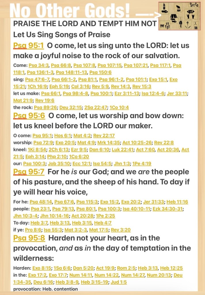 Today’s lesson Psalms 95/150, today’s verses: “Your ears shall hear a word behind you, saying, “This is the way, walk in it,” Whenever you turn to the right hand Or whenever you turn to the left.” Isaiah 30:21 ❤️ “For God did not send His Son into the world to condemn the world, but that the world through Him might be saved.” John 3:17 🚶♂️ “Now as He sat on the Mount of Olives, the disciples came to Him privately, saying, “Tell us, when will these things be? And what will be the sign of Your coming, and of the end of the age?”” Matthew 24:3 “And do not be conformed to this world, but be transformed by the renewing of your mind, that you may prove what is that good and acceptable and perfect will of God.”Romans 12:2 NKJV “O come, let us sing joyfully to the Lord; Let us shout joyfully to the rock of our salvation. ¶O come, let us worship and bow down, Let us kneel before the Lord our Maker [in reverent praise and prayer]. For He is our God And we are the people of His pasture and the sheep of His hand. Today, if you will hear His voice, [Heb 3:7-11] Do not harden your hearts and become spiritually dull as at Meribah [the place of strife], And as at Massah [the place of testing] in the wilderness, [Ex 17:1-7; Num 20:1-13; Deut 6:16]” Psalms 95:1, 6-8 AMP KNOW LOVE DON’T TEMPT HIM … GOD IS OMNISCIENT, OMNIPOTENT, OMNIPRESENT Nothing that we’re seeing or experiencing is news to Him; This Is Why we’ve been given THE WORD: THE LAW (YAH’S SPOKEN WORD: The Rules Of Engagement ), The Bible The Written Word: TEACHING INSTRUCTION EXAMPLE Because Knowledge Is Power to Keep us from falling and Keep us from death. HalleluYAH! BeLoved Tempting (Trying to Test in a sinful manner) GOD comes with Eternal Consequences so in life Proceed With Caution; our best guard Is to engage in regular Bible Study building our personal relationship with and ability to hear from THE RUACH HA’QUODESH: THE HOLY SPIRIT And THE VOICE OF GOD THE FATHER; KNOW LOVE DON’T TEMPT HIM … sin has No allure to GOD: YAH IS Disgusted By sin (All sin 🤮Is Repulsive to our HOLY GOD: like an Allergy He Will Abstain or Separate Himself from it) It’s Only when we KNOW YAH ELOHIM for real we will Have A ReNewed Mind (Repentant Heart: Converted Fully Surrendered To ALMIGHTY GOD) Then we will Know The Will Of GOD (For ourselves and) for our lives and Willingly Comply: we Heed as an act of Love, Respect and Worship. Isaiah 55:3 Incline your ear, and come unto me: hear, and your soul shall live; and I will make an everlasting covenant with you, even the sure mercies of David. Matthew 3:2-3 And saying, Repent ye: for the kingdom of heaven is at hand. For this is he that was spoken of by the prophet Esaias, saying, The voice of one crying in the wilderness, Prepare ye the way of the Lord, make his paths straight. KNOW LOVE DON’T TEMPT HIM It’s a sure path to Provoking YAH’S WRATH; YAH Desires To Save Not Destroy Life. Romans 2:5 But after thy hardness and impenitent heart treasurest up unto thyself wrath against the day of wrath and revelation of the righteous judgment of God; Hebrews 12:25 See that ye refuse not him that speaketh. For if they escaped not who refused him that spake on earth, much more shall not we escape, if we turn away from him that speaketh from heaven: