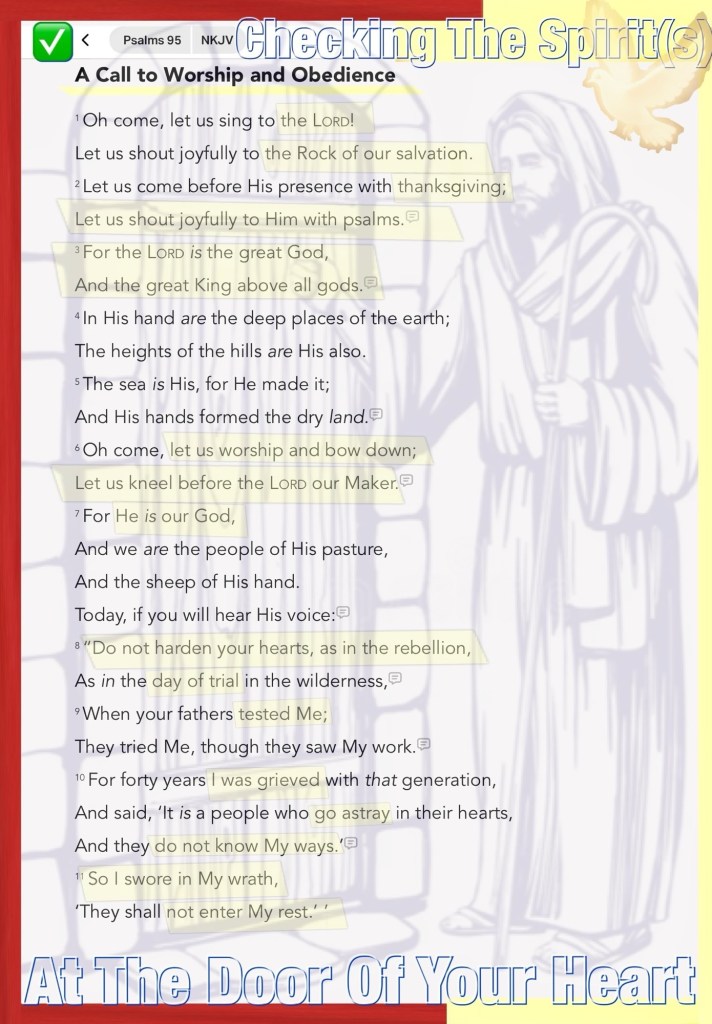 “Oh come, let us sing to the Lord! Let us shout joyfully to the Rock of our salvation. Oh come, let us worship and bow down; Let us kneel before the Lord our Maker. For He is our God, And we are the people of His pasture, And the sheep of His hand. Today, if you will hear His voice: “Do not harden your hearts, as in the rebellion, As in the day of trial in the wilderness,” Psalms 95:1, 6-8 NKJV
