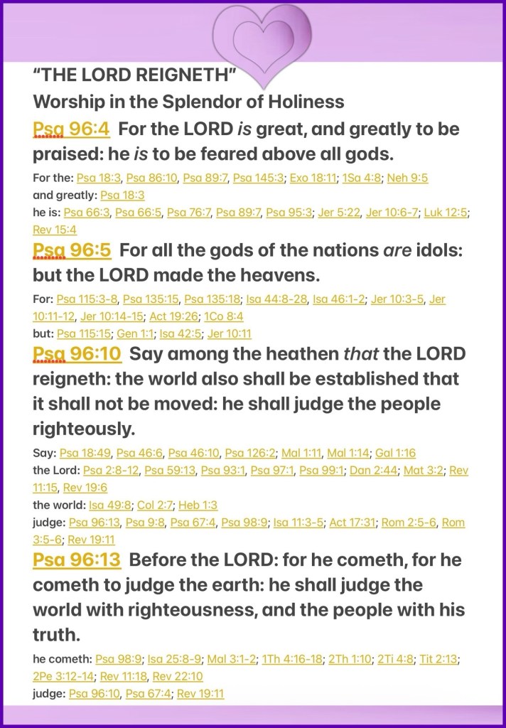 “For the Lord is great and greatly to be praised; He is to be feared above all gods. For all the gods of the peoples are idols, But the Lord made the heavens. Say among the nations, “The Lord reigns; The world also is firmly established, It shall not be moved; He shall judge the peoples righteously.” For He is coming, for He is coming to judge the earth. He shall judge the world with righteousness, And the peoples with His truth.” Psalms 96:4-5, 10, 13 NKJV