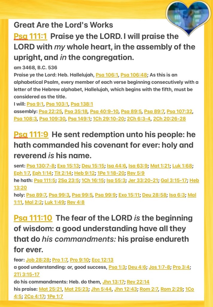 Today’s lesson Psalms 111 /150, today’s verses: “So then faith comes by hearing, and hearing by the word of God.” Romans 10:17 ❤️ “But seek first the kingdom of God and His righteousness, and all these things shall be added to you.” Matthew 6:33 NKJV 🚶♂️ “Therefore, having these promises, beloved, let us cleanse ourselves from all filthiness of the flesh and spirit, perfecting holiness in the fear of God.” II Corinthians 7:1 “By this we know love, because He laid down His life for us. And we also ought to lay down our lives for the brethren.” I John 3:16 NKJV