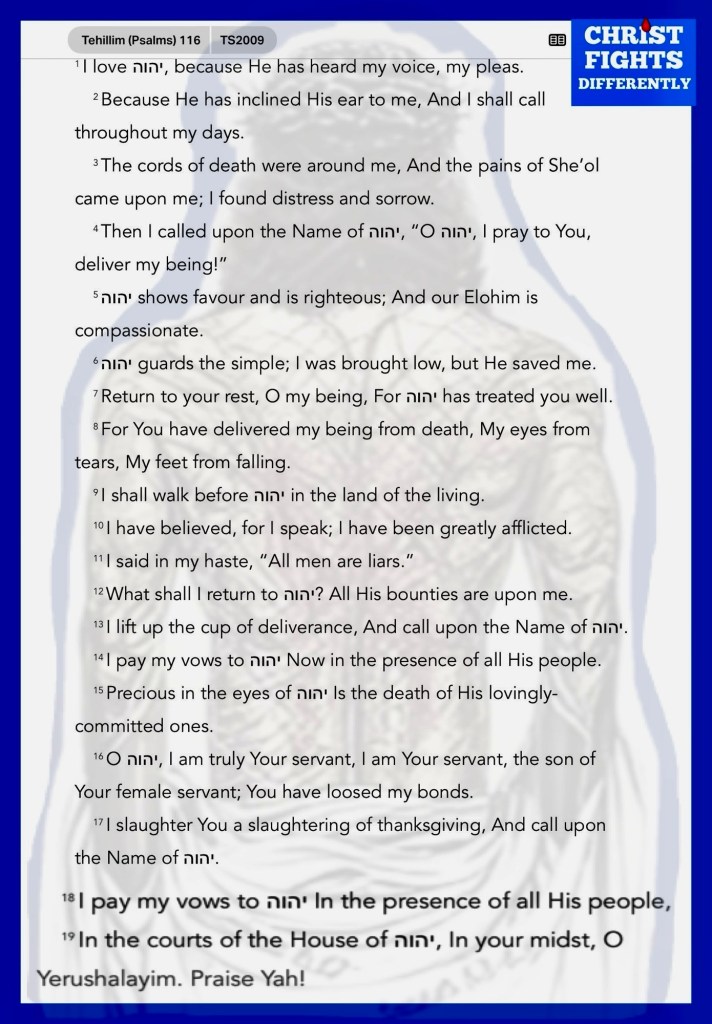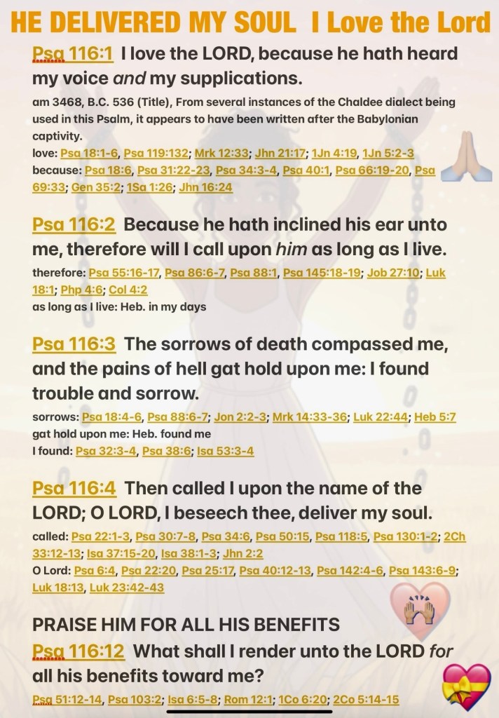 “I love the Lord, because He has heard My voice and my supplications. Because He has inclined His ear to me, Therefore I will call upon Him as long as I live. The pains of death surrounded me, And the pangs of Sheol laid hold of me; I found trouble and sorrow. Then I called upon the name of the Lord: “O Lord, I implore You, deliver my soul!” What shall I render to the Lord For all His benefits toward me?” Psalms 116:1-4, 12 NKJV