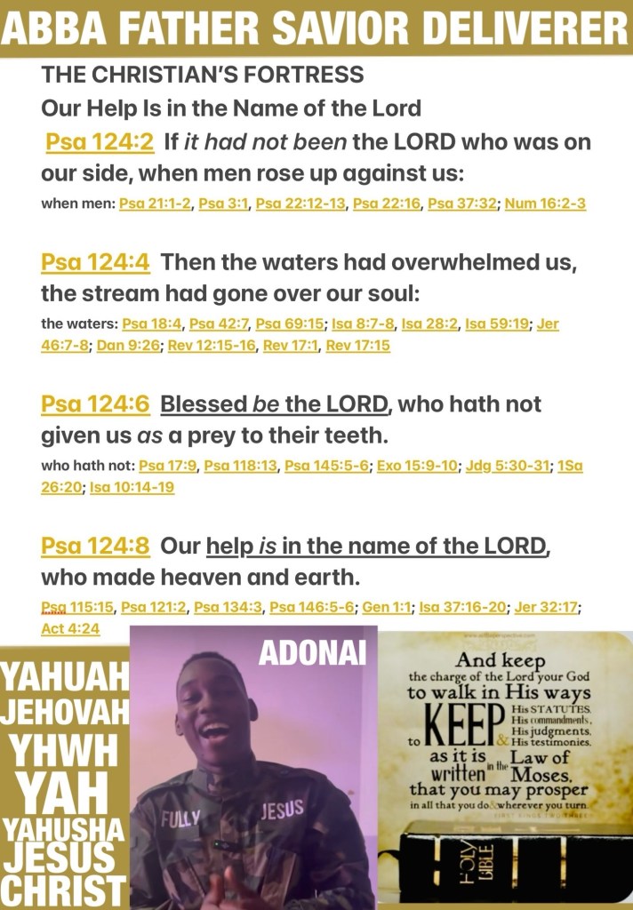 Today’s lesson Psalms 124/150, today’s verses: “Jesus said to him, ❤️“If you want to be perfect, go, sell what you have and give to the poor, and you will have treasure in heaven; and come, follow Me.”” Matthew 19:21 “Thus says the Lord God to these bones: “Surely I will cause breath to enter into you, and you shall live.” Ezekiel 37:5 NKJV 🚶♂️ “But Moses said to God, “Who am I that I should go to Pharaoh, and that I should bring the children of Israel out of Egypt?” So He said, “I will certainly be with you. And this shall be a sign to you that I have sent you: When you have brought the people out of Egypt, you shall serve God on this mountain.”” Exodus 3:11-12 “And Jesus said to them,❤️ “I am the bread of life. He who comes to Me shall never hunger, and he who believes in Me shall never thirst.” John 6:35 NKJV The Christian’s FORTRESS: Our HELP IS In The Name Of THE LORD YAH! Believe It: BeLoved This Is A Message To The Dry Bones GOD Wants To Make You A Fountain ⛲️ Overflowing In His BLESSINGS Living In YAH’S LOVE (and Sharing Walk Good!)