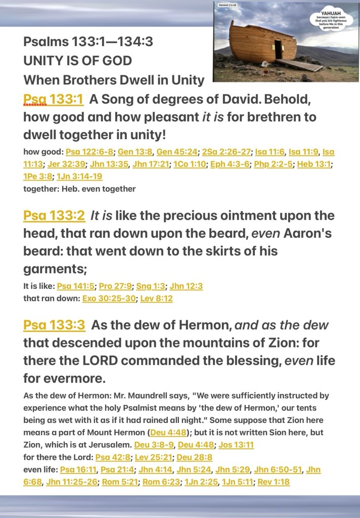 “Behold, how good and how pleasant it is For brethren to dwell together in unity! It is like the precious oil upon the head, Running down on the beard, The beard of Aaron, Running down on the edge of his garments. It is like the dew of Hermon, Descending upon the mountains of Zion; For there the Lord commanded the blessing— Life forevermore.” Psalms 133:1-3 NKJV