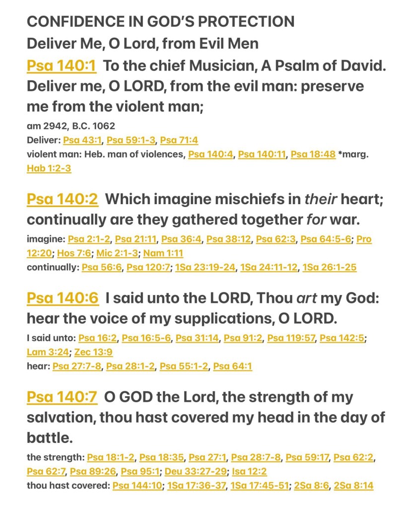 “Deliver me, O Lord, from evil men; Preserve me from violent men, Who plan evil things in their hearts; They continually gather together for war. I said to the Lord: “You are my God; Hear the voice of my supplications, O Lord. O God the Lord, the strength of my salvation, You have covered my head in the day of battle.” Psalms 140:1-2, 6-7 NKJV