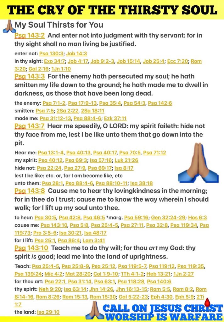 Greetings BeLoved child Of THE MOST HIGH GOD יהוה YAH ELOHIM : THE CREATOR: AUTHOR ✍🏽 HOLY AUTHORITY: THE OMNIPRESENT OMNISCIENT OMNIPOTENT RIGHTEOUS DEFENSE THE SACRIFICE SAVIOR JUDGE JUSTICE REDEEMER REFUGE ADONAI YHWH THE HOLY SPIRIT OF TRUTH THE LAW THE TREASURE AND PROMISE OF HEAVEN EMBODIED In The Person Of JESUS CHRIST THE WORD ABBA YAH EL SHADDAI! 24/7/365 AGAPÈ LOVE POURED OUT TO BLESS The Thirsty Soul HalleluYAH! Spiritual War Fact ⚠️ The Thirsty Soul Is In Dire Need Of Prayer; please be willing to (intervene) intercede on behalf of the many Lukewarm; Apathetic bordering spiritually dead restless unbelievers that may be surrounding you this very moment. Their suffering is actually very real, Relationship With CHRIST Is The Only Solution. ❤️““Now when the unclean spirit has gone out of a man, it roams through waterless (dry, arid) places in search of rest, but it does not find it.” Matthew 12:43 AMP. ⚖️ Romans 3:20 Therefore by the deeds of the law there shall no flesh be justified in his sight: for by the law is the knowledge of sin. Exodus 34:7 Keeping mercy for thousands, forgiving iniquity and transgression and sin, and that will by no means clear the guilty; visiting the iniquity of the fathers upon the children, and upon the children’s children, unto the third and to the fourth generation. 🙏🏽 “And do not enter into judgment with Your servant, For in Your sight no man living is righteous or justified. [Ps 130:3; Rom 3:20-26; Gal 2:16] For the enemy has persecuted me, He has crushed my life down to the ground; He has made me dwell in dark places, like those who have been long dead. ¶Answer me quickly, O Lord, my spirit fails; Do not hide Your face from me, Or I will become like those who go down into the pit (grave). Let me hear Your lovingkindness in the morning, For I trust in You. Teach me the way in which I should walk, For I lift up my soul to You. ¶Teach me to do Your will [so that I may please You], For You are my God; Let Your good Spirit lead me on level ground.” Psalms 143:2-3, 7-8, 10 AMP