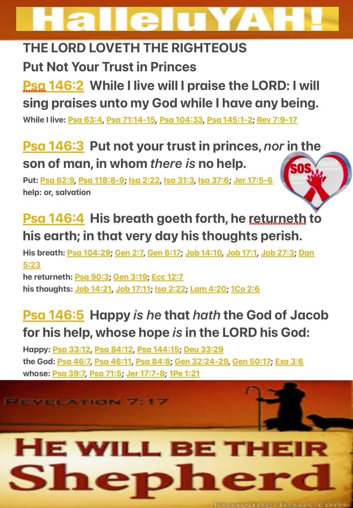 Greetings BeLoved child of THE MOST HIGH YHWH YIRÈH ELOHIM: 3 CO ETERNAL SUPREME SPIRITUAL BEINGS: ABBA FATHER YAH: THE VOICE; YAH: THE SON: THE WORD, THE RUACH HA’QUODESH: THE HOLY SPIRIT: THE BREATH; Collectively we know Them By Title(s) THE CREATOR: THE COMMANDER: THE LAW: PROVIDER: FATHER: SAVIOR: DELIVERER: LOVE… Every Name: Title Is A Description Speaking To THE MAGNIFICENCE OF YAH And How we can Respectfully engage THE GODHEAD; now more than ever we all need to Repent And Honor YAH ELOHIM TO GOD BE THE GLORY our HELP And HOPE In Every Situation GLORY HalleluYAH! “While I live I will praise the Lord; I will sing praises to my God as long as I live. Do not trust in princes, In mortal man, in whom there is no salvation (help). When his spirit leaves him, he returns to the earth; In that very day his thoughts and plans perish. [1 Cor 2:6] How blessed and graciously favored is he whose help is the God of Jacob (Israel), Whose hope is in the Lord his God, [Gen 32:30]” Psalms 146:2-5 AMP “I will never forget Your precepts, For by them You have revived me and given me life.” Psalms 119:93 “I have fought the good and worthy and noble fight, I have finished the race, I have kept the faith [firmly guarding the gospel against error].” 2 Timothy 4:7 AMP THE WORD IS CPR 🩺 ❤️To the weary over burdened soul Jeremiah 17:7-8 Blessed is the man that trusteth in the LORD, and whose hope the LORD is. For he shall be as a tree planted by the waters, and that spreadeth out her roots by the river, and shall not see when heat cometh, but her leaf shall be green; and shall not be careful in the year of drought, neither shall cease from yielding fruit. 🌅 It’s Preparation Day The Sabbath starts at sunset may your hearts and homes Be Ready we have a Date With THE KING Be Loved Be CHRIST CONFIDENT, TO YAH BE THE GLORY every week we have a dress rehearsal for The Revelation 7 Big Event GLORY HalleluYAH!
