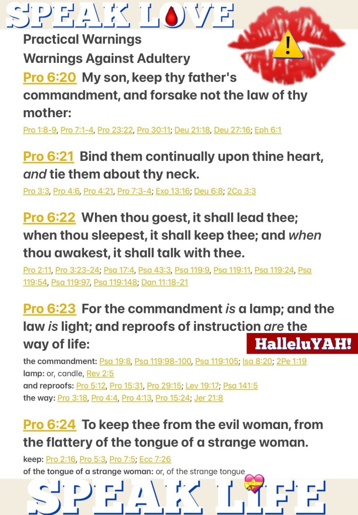 Greetings BeLoved child of THE MOST HIGH יהוה YHWH ELOHIM: THE CREATOR: AUTHOR ✍🏽 AUTHORITY: OMNIPRESENT OMNIPOTENT OMNISCIENT THE LAW RIGHTEOUS JUDGE JUSTICE TRUTH: ABBA YAH AGAPÈ LOVE: THE WORD JESUS CHRIST EL SHADDAI THE GREATEST SPIRITUAL BEING: I AM THAT I AM: FULL COVERAGE PROTECTION. Welcome to Bible Study I pray this finds you well, now more than ever we Need THE WORD: THE LAW: PROTECTION From the serpent’s kiss: “¶My son, be guided by your father’s [God-given] commandment (instruction) And do not reject the teaching of your mother; [Eph 6:1-3] Bind them continually upon your heart (in your thoughts), And tie them around your neck. [Prov 3:3; 7:3] When you walk about, they (the godly teachings of your parents) will guide you; When you sleep, they will keep watch over you; And when you awake, they will talk to you. For the commandment is a lamp, and the teaching [of the law] is light, And reproofs (rebukes) for discipline are the way of life, [Ps 19:8; 119:105] To keep you from the evil woman, From [the flattery of] the smooth tongue of an immoral woman.” Proverbs 6:20-24 AMP “But Joseph said to them, “Do not be afraid, for am I in the place of God? [Vengeance is His, not mine.] As for you, you meant evil against me, but God meant it for good in order to bring about this present outcome, that many people would be kept alive [as they are this day].” Genesis 50:19-20 “And if the Spirit of Him who raised Jesus from the dead lives in you, He who raised Christ Jesus from the dead will also give life to your mortal bodies through His Spirit, who lives in you.” Romans 8:11 AMP 🚶♂️ “All things were made and came into existence through Him; and without Him not even one thing was made that has come into being. In Him was life [and the power to bestow life], and the life was the Light of men.” John 1:3-4 “For the word of God is living and active and full of power [making it operative, energizing, and effective]. It is sharper than any two-edged sword, penetrating as far as the division of the soul and spirit [the completeness of a person], and of both joints and marrow [the deepest parts of our nature], exposing and judging the very thoughts and intentions of the heart.” Hebrews 4:12 AMP ⚠️Spiritual War Fact: The enemy: adversary: snake (or however he’s disguised) … is coming at us fast and furious he Is Not your Friend! “Then I saw another beast rising up out of the earth; he had two horns like a lamb and he spoke like a dragon. [Matt 7:15, 16]” Revelation 13:11 AMP Break Up With Sin: Walk Good: Be Loved