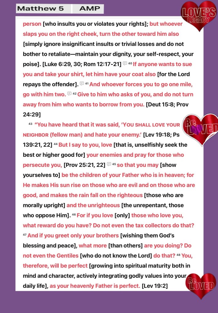 Greetings BeLoved child of THE MOST HIGH יהוה YAHUAH ELOHIM: THE GODHEAD: THE CREATOR: AUTHOR ✍🏽 AUTHORITY: THE COMMANDER LAW JUDGE TRUTH: OMNIPOTENT OMNIPRESENT OMNISCIENT THE HOLY SET APART SPIRIT יהושע YAHUSHA JESUS MESSIAH SOVEREIGN SAVIOR SACRIFICE SHIELD COMFORTER… I AM THAT I AM: AGAPÈ LOVE ON PURPOSE THE WORD PERSONIFIED; LISTEN Be Loved Be LOVE. ❤️ “You, therefore, will be perfect [growing into spiritual maturity both in mind and character, actively integrating godly values into your daily life], as your heavenly Father is perfect. [Lev 19:2]” Matthew 5:48 “¶“Listen to this, Job; Stand still and consider the wonders of God. “Do you know how God establishes and commands them, And makes the lightning of His [storm] cloud shine?” Job 37:14-15 “Put on the full armor of God [for His precepts are like the splendid armor of a heavily-armed soldier], so that you may be able to [successfully] stand up against all the schemes and the strategies and the deceits of the devil.”Ephesians 6:11 AMP 🚶♂️ ❤️““For God so [greatly] loved and dearly prized the world, that He [even] gave His [One and] only begotten Son, so that whoever believes and trusts in Him [as Savior] shall not perish, but have eternal life.” John 3:16 “We love, because He first loved us.” 1 John 4:19 AMP “¶If you are slack (careless) in the day of distress, Your strength is limited. ¶Rescue those who are being taken away to death, And those who stagger to the slaughter, Oh hold them back [from their doom]! If you [claim ignorance and] say, “See, we did not know this,” Does He not consider it who weighs and examines the hearts and their motives? And does He not know it who guards your life and keeps your soul? And will He not repay [you and] every man according to his works? Know that [skillful and godly] wisdom is [so very good] for your life and soul; If you find wisdom, then there will be a future and a reward, And your hope and expectation will not be cut off.” Proverbs 24:10-12, 14 AMP 💌 Like The Sabbath, Bible Study is supposed to Be a transformative experience our opportunity to Love With Intention; Glorifying GOD. THE WORD As “It Is Written” Displayed In The Bible Is LOVE’S Instructional Manual LISTEN Be Loved Be LOVE. Happy Preparation Day 🌅 Blessings