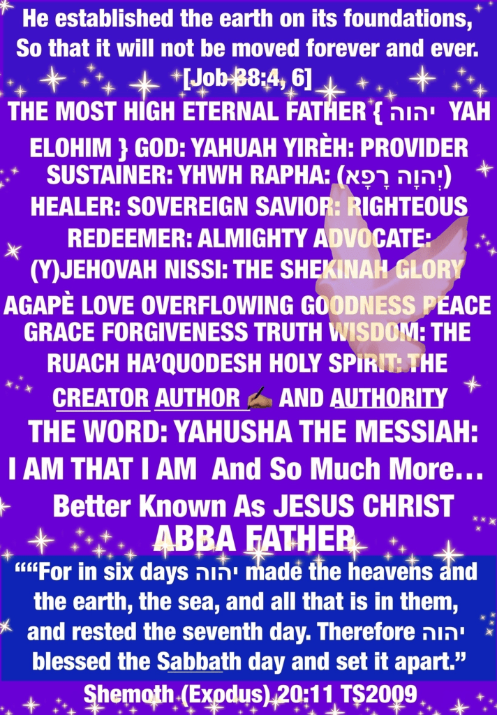 Greetings BeLoved child of THE MOST HIGH GOD: יהוה YAHUAH YIRÈH: THE CREATOR: AUTHOR ✍🏽 AUTHORITY: OMNIPRESENT OMNIPOTENT: THE LAW JUDGE RIGHTEOUSNESS HOLINESS TRUTH: AGAPÈ LOVE: יהושע YAHUSHA THE MESSIAH JESUS CHRIST: PERFECTION THE HUSBANDMAN THE HOLY SET APART SPIRIT: THE COMFORTER THE REFINER THE WORD OF YAH OMNISCIENT: THE STANDARD EMBODIED In ACTION PERSONIFIED: (Y)JEHOVAH-NISSI “THE LORD YAH our BANNER” Exo. 17:8,15; 20:1-11… I AM THAT I AM: IMMANUEL “THE SIGN” GOD With us. Human Probation Is soon to close ⚖️ and The Church Is In Need of DELIVERANCE ⏳Look Up YAH IS THE SIGN⌛️CALL CHRIST 🙏🏽HEED THE WORD Allowing ABBA YHWH SOVEREIGNTY He Will Prepare you, He Will Redeem you, He Will Abide In you: “Therefore the Lord Himself will give you a sign: Behold, the virgin shall conceive and bear a Son, and shall call His name Immanuel.” Isaiah 7:14 Sign H226 (Strong) אוֹת ‘ôth oth Probably from H225 (in the sense of appearing); a signal (literally or figuratively), as a flag, beacon, monument, omen, prodigy, evidence, etc.: – mark, miracle, (en-) sign, token. H225 (Strong) אוּת ‘ûth ooth A primitive root; properly to come, that is, (impliedly) to assent: – consent. THE COMMANDMENT’S Are His VOW Of LOVE: Code Of Conduct: CHRIST CHARACTER Codified To Always All Way Keep THE WORD OF YAHWEH Walk In TRUTH BE BLESSED! YAH IS THE SIGN