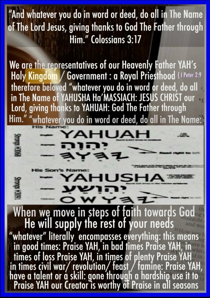Greetings BeLoved child of THE MOST HIGH GOD: יהוה YAHUAH YIRÈH: THE CREATOR: AUTHOR ✍🏽 AUTHORITY: OMNIPRESENT OMNIPOTENT: THE LAW JUDGE RIGHTEOUSNESS HOLINESS TRUTH: AGAPÈ LOVE: יהושע YAHUSHA THE MESSIAH JESUS CHRIST: PERFECTION THE HUSBANDMAN THE HOLY SET APART SPIRIT: THE COMFORTER THE REFINER THE WORD OF YAH ELOHIM OMNISCIENT: THE STANDARD EMBODIED In ACTION PERSONIFIED: (Y)JEHOVAH-NISSI “THE LORD YAH our BANNER” Exo. 17:8,15; 20:1-11… I AM THAT I AM: our FATHER IMMANUEL. YAHUAH -M’KADDESH: JEHOVAH M’KADDESH: QUODESH: HOLY: SANCTIFIER “THE LORD Who Sanctifies, Makes Holy” Exo.31:13, Lev.20:8, 1 Thess.5:23 *Set Apart: A Season For Seasoning, Reasoning And Relationship. HalleluYAH! “The words of Agur the son of Jakeh, the oracle: The man says to Ithiel, to Ithiel and to Ucal: Who has ascended into heaven and descended? Who has gathered the wind in His fists? Who has bound the waters in His garment? Who has established all the ends of the earth? What is His name, and what is His Son’s name? Certainly you know! [John 3:13; Rev 19:12] ¶Every word of God is tested and refined [like silver]; He is a shield to those who trust and take refuge in Him. [Ps 18:30; 84:11; 115:9-11]” Proverbs 30:1, 4-5 AMP