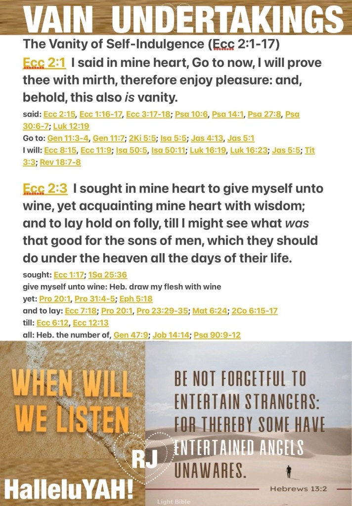 Just listen: “I explored with my mind how to gratify myself with wine while [at the same time] having my mind remain steady and guide me wisely; and how to take control of foolishness, until I could see / * “Wine is a mocker, Strong drink is a brawler, And whoever is [intoxicated] led astray by it is not wise.” [Prov 23:29, 30; Is 28:7; Hos 4:11] Proverbs 20:1 “Your [drunken] eyes will see strange things And your mind will utter perverse things [untrue things, twisted things].” Proverbs 23:33 AMP / what was good for the sons of men to do under heaven all the days of their lives. Also, I collected for myself silver and gold and the treasure of kings and provinces. I provided for myself male singers and female singers, and the delights and pleasures of men —many concubines. [1 Kin 9:28; 10:10, 14, 21]” Ecc 2:8 AMP “And I Hated Life” “I searched in my heart how to stimulate my body with wine, while guiding my heart with wisdom, and how to lay hold on folly, until I could see what was good for the sons of men to do under the heavens all the days of their lives. I also gathered for myself silver and gold and the treasures of sovereigns and of the provinces. I provided male and female singers for myself, and the pleasures of men – a woman and women.” Qoheleth (Ecclesiastes) 2:3, 8 TS2009 🎧 that perspective is a Spiritual Attack; Spiritual War Fact: The Constant Collection Of Bodies: Relationships: Things Speaks Volumes About The GOD Sized Hole That Can Never Be Filled With Anything Other Than THE RUACH HA’QUODESH: THE BREATH OF LIFE: THE HOLY SPIRIT! REAL AGAPÈ LOVE When WISDOM SPEAKS He Will Shift your focus from you to The Body Of Believer’s As in looking outside of yourself (ishness) ❤️ “Heal the sick, cleanse the lepers, raise the dead, cast out demons. Freely you have received, freely give.” Matthew 10:8 NKJV { ❤️““…You have received without paying, give without being paid.” Mattithyahu (Matthew) 10:8 TS2009] “You too, be patient; strengthen your hearts [keep them energized and firmly committed to God], because the coming of the Lord is near.” James 5:8 AMP “but now revealed by the appearing of our Saviour יהושע Messiah, who indeed abolished death and brought life and incorruptibility to light through the Good News,” Timotiyos Bĕt (2 Timothy) 1:10 TS2009 Get Ready Stay Ready Be BLESSED Happy New Week